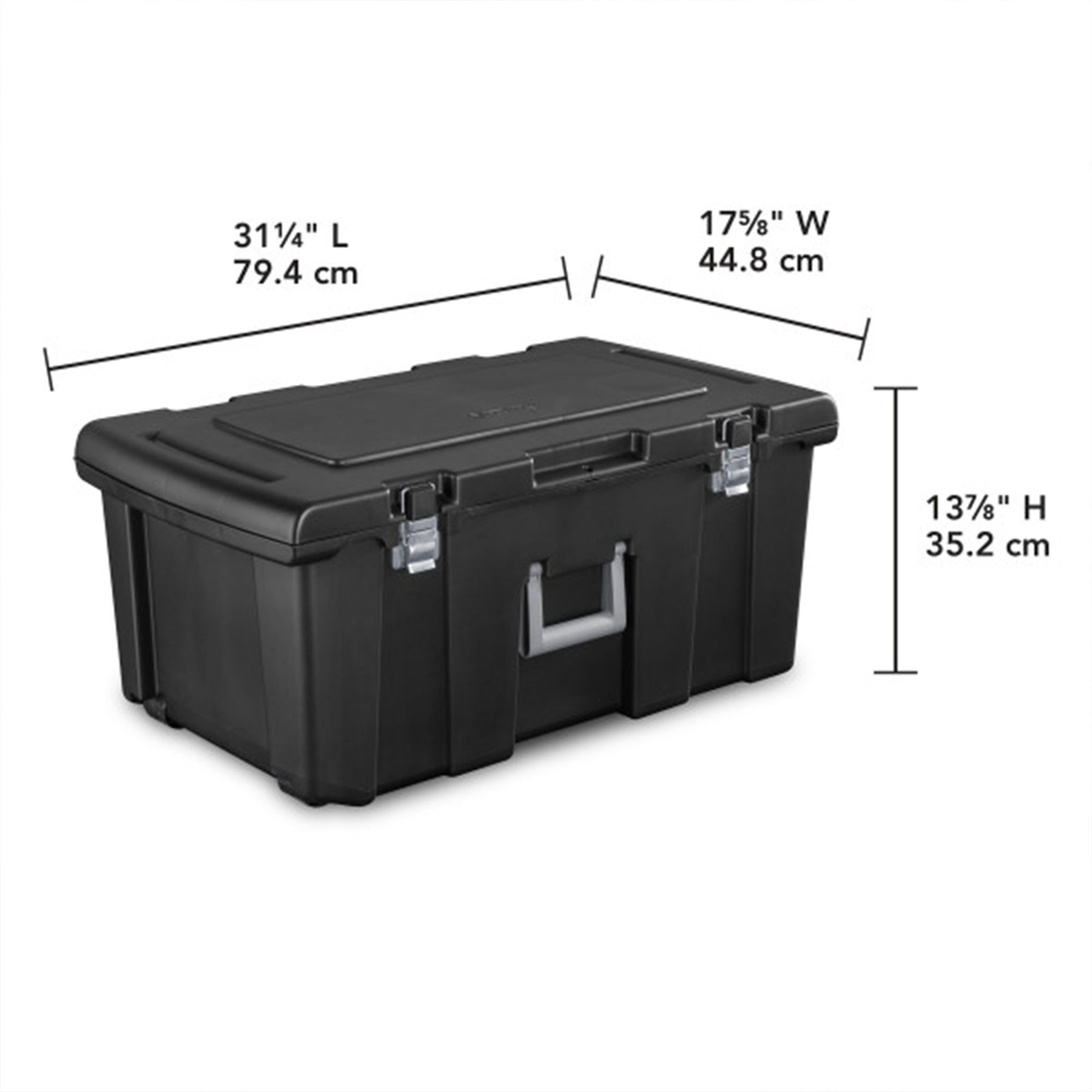 The smooth-rolling wheels and ergonomic handles allow for easier transporting of heavy loads, making these footlockers great companions for moving, or on-the-go living. Use the integrated side handles or the full grip bail style handle when carrying light loads. These footlockers utilize metal hinges and latches and accept a standard-size padlock for added security (not included). The overall assembled dimensions of each tote are 31.25 inches long x 17.60 inches wide x 13.70 inches high.