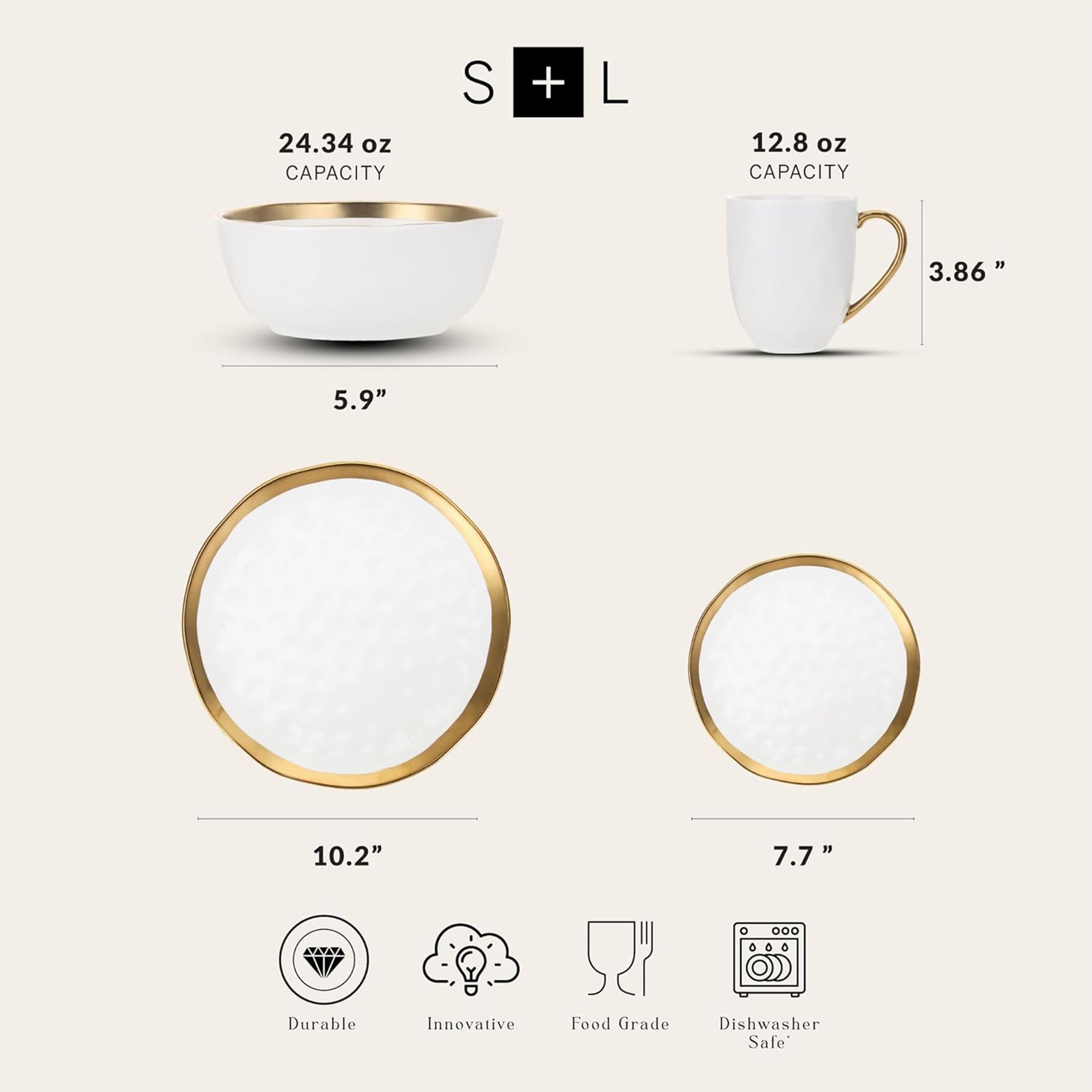 • Florian dinnerware set features a bold gold trim and pebbled texture to elevate everyday meals with a luxurious touch