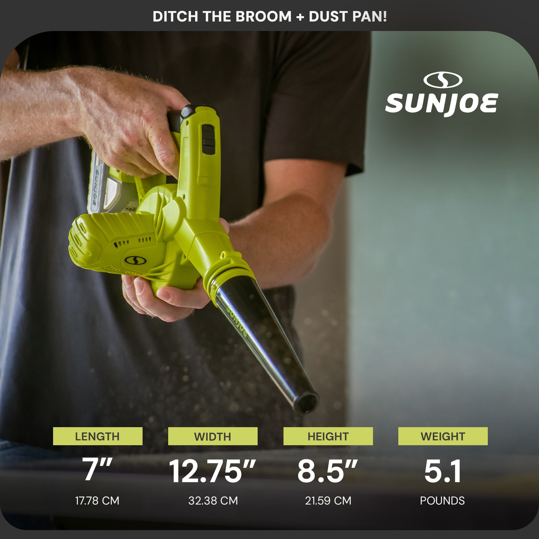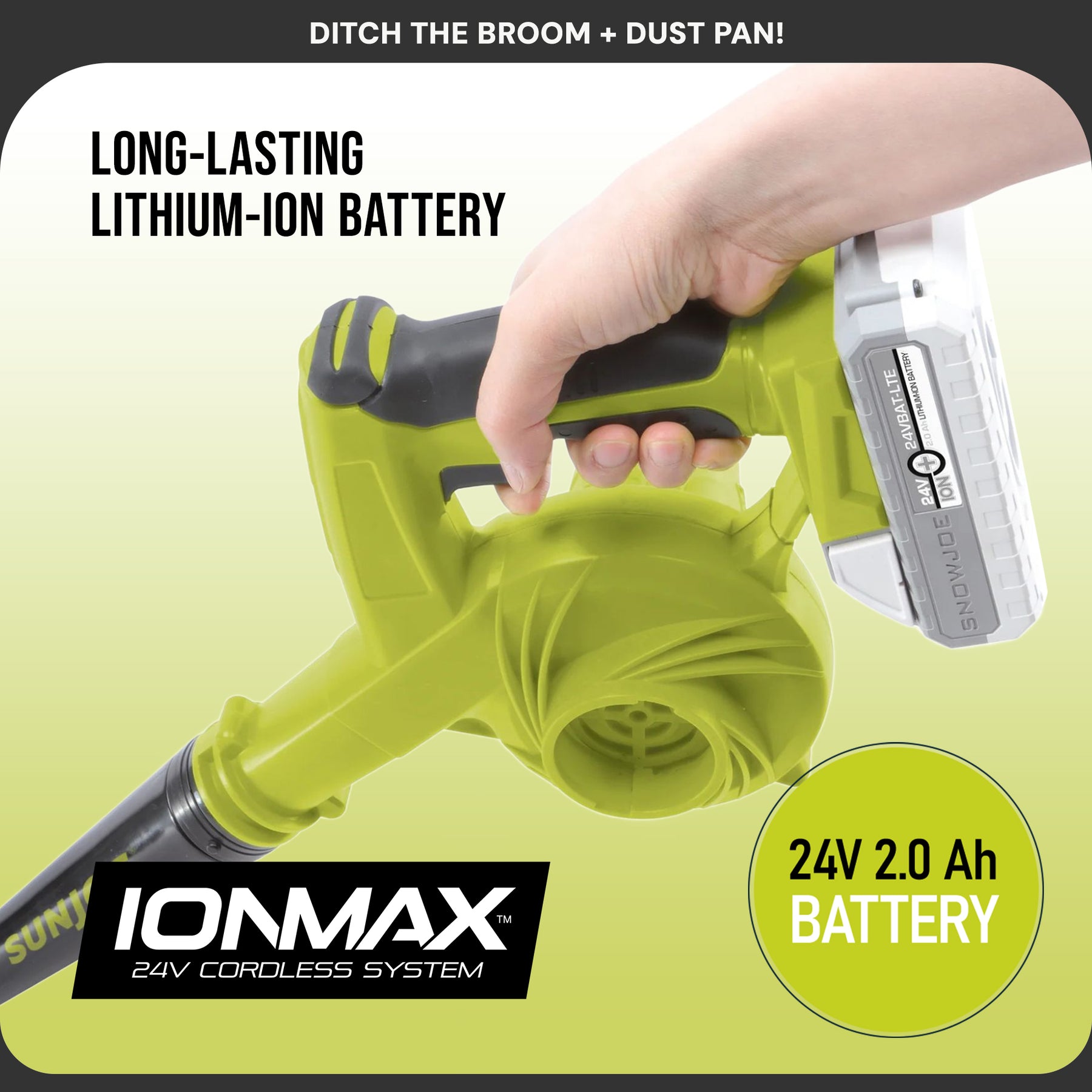 DITCH THE BROOM + DUST PAN! Keep your workshop space clean and dust-free with the 24-Volt* Cordless Workshop Blower + Vacuum from SUN JOE. This 2-in-1 tool easily converts from a blower ideal for sweeping away dust and debris, to a vacuum keep your workspace, garage, shed, and more clean. Powered by the revolutionary 24-Volt* IONMAX battery system, SUN JOE offers peak power + performance without the gas, fumes, or tangled extension cords. The IONMAX battery provides rechargeable runtime with no-fade power + performance, and cord-free, gas-free, rechargeable power! Ideal for sweeping large areas, and blowing dust out of cracks and crevices, SUN JOE comes equipped with 2 speed settings, for up to 185 mph of air speed and 105 cfm of air flow. The included tethered crevice nozzles are perfect for reaching debris in tight and cramped spaces. So, toss out the broom and clean up your workspace faster than ever with the 24-Volt* Cordless Workshop Blower + Vacuum from SUN JOE®. GET EQUIPPED®.