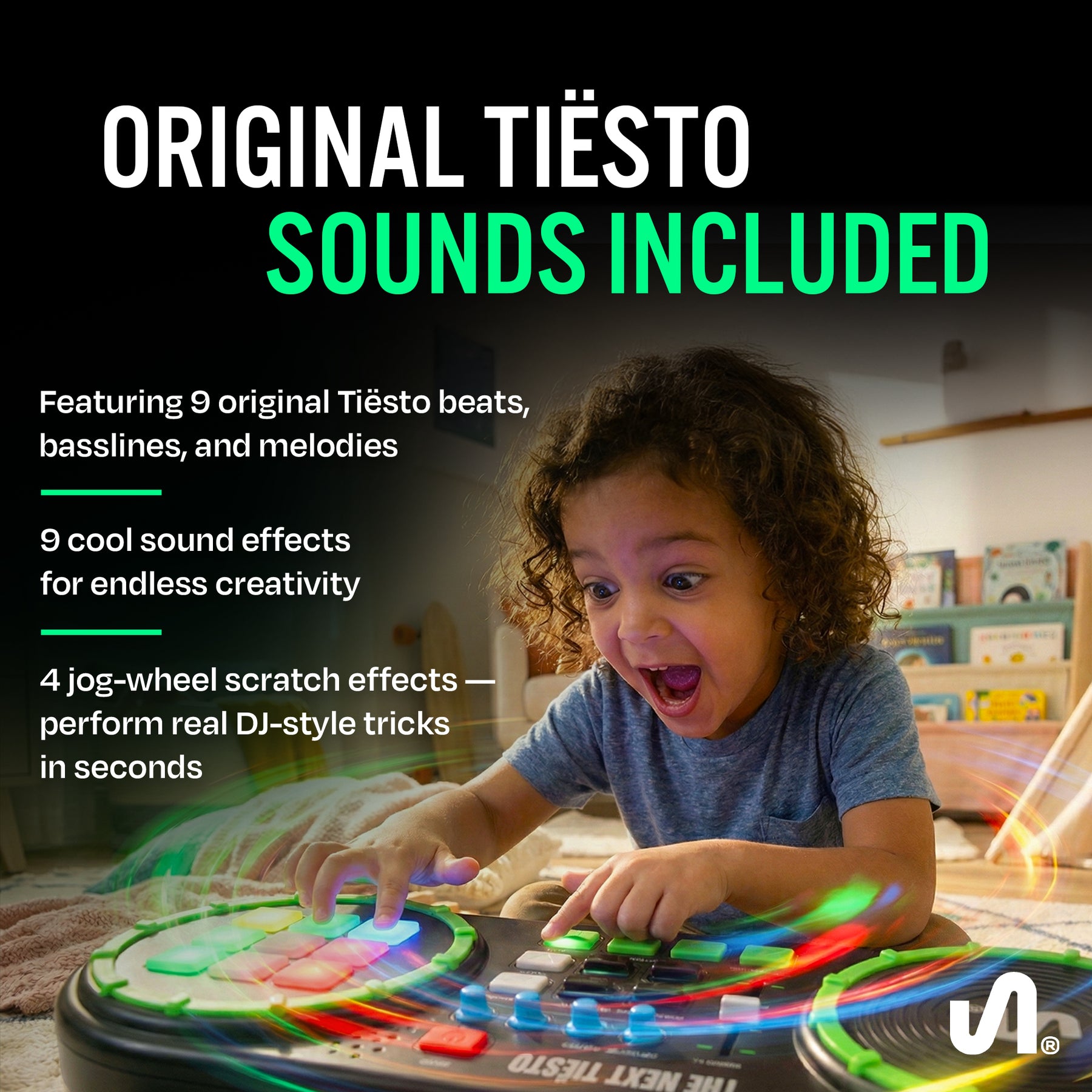 - Kids DJ board includes original TIESTO 9 beats, baselines, and melodies