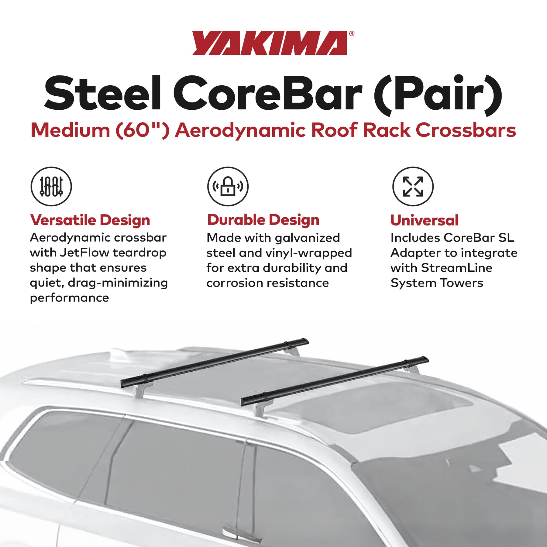 • Includes coreBar SL adapter, seamlessly integrating with streamline system towers, Yakima gear mounts, and other universal systems for versatile compatibility