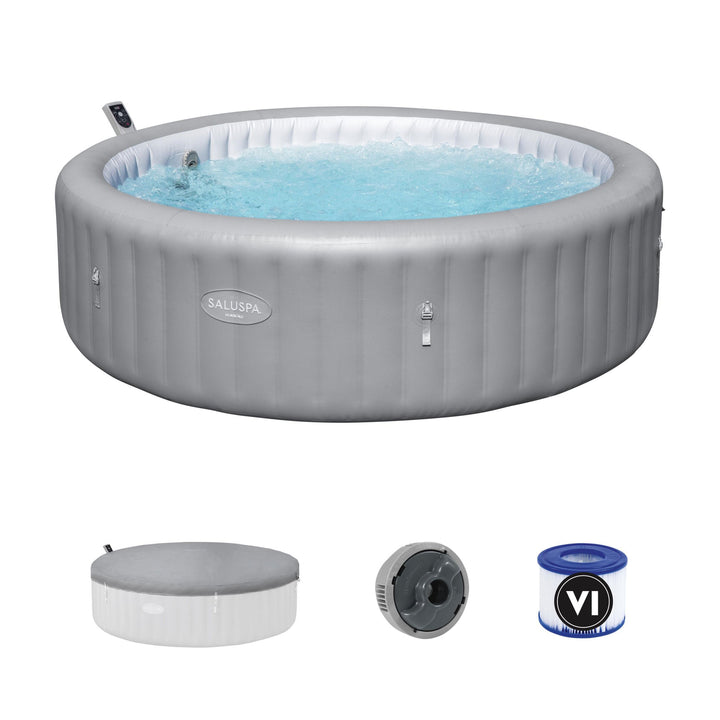 - Includes a spa cover, spa pump, ChemConnect dispenser, filter cartridge (VI), and a repair patch