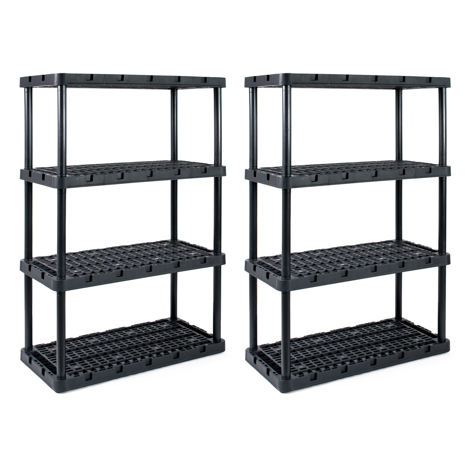 These plastic storage shelves can function as your garage storage or shelf organizer, allowing you to easily organize and store various items. With its simple, no-tool setup, lightweight body, and black coloring, you can easily make this storage unit work in any room of the house. Easily snap all the included parts of this multi-purpose unit together for a simple, no-stress installation process. Plus, with the Knect-A-Shelf feature, you can interconnect multiple units from any side for added storage space (additional units sold separately). Constructed of durable and lightweight materials, the storage possibilities are endless. Each shelf is ventilated and made to support up to 150 pounds and up to 750 pounds overall, allowing you to organize seasonal clothing items, home decor, toys, supply crafts, and other tools or accessories. Make sure that you distribute the weight evenly on the fixed shelves. This organizing shelf offers an ideal height for both kids and adults and is a great addition to any home or office space.