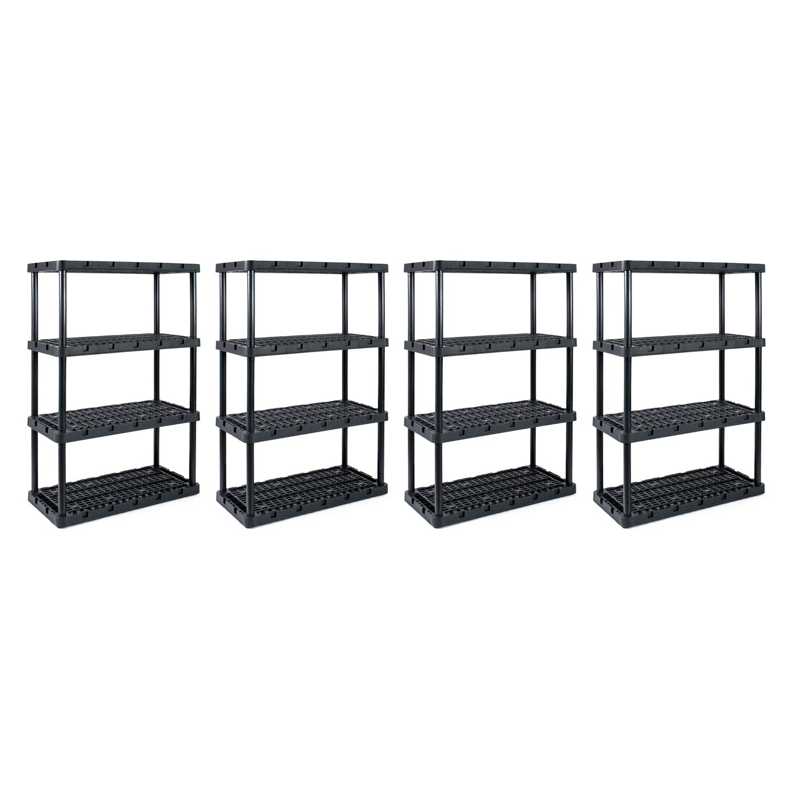 These plastic storage shelves can function as your garage storage or shelf organizer, allowing you to easily organize and store various items. With its simple, no-tool setup, lightweight body, and black coloring, you can easily make this storage unit work in any room of the house. Easily snap all the included parts of this multi-purpose unit together for a simple, no-stress installation process. Plus, with the Knect-A-Shelf feature, you can interconnect multiple units from any side for added storage space (additional units sold separately). Constructed of durable and lightweight materials, the storage possibilities are endless. Each shelf is ventilated and made to support up to 150 pounds and up to 750 pounds overall, allowing you to organize seasonal clothing items, home decor, toys, supply crafts, and other tools or accessories. Make sure that you distribute the weight evenly on the fixed shelves. This organizing shelf offers an ideal height for both kids and adults and is a great addition to any home or office space.