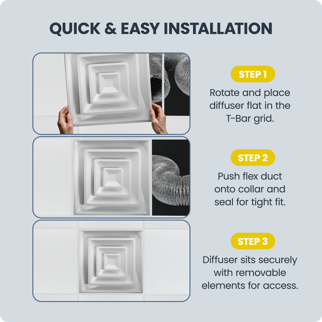 Finished in a Bright White powder coat, this diffuser combines durability, function, and clean aesthetics—making it a reliable solution for both new construction and retrofit HVAC installations.