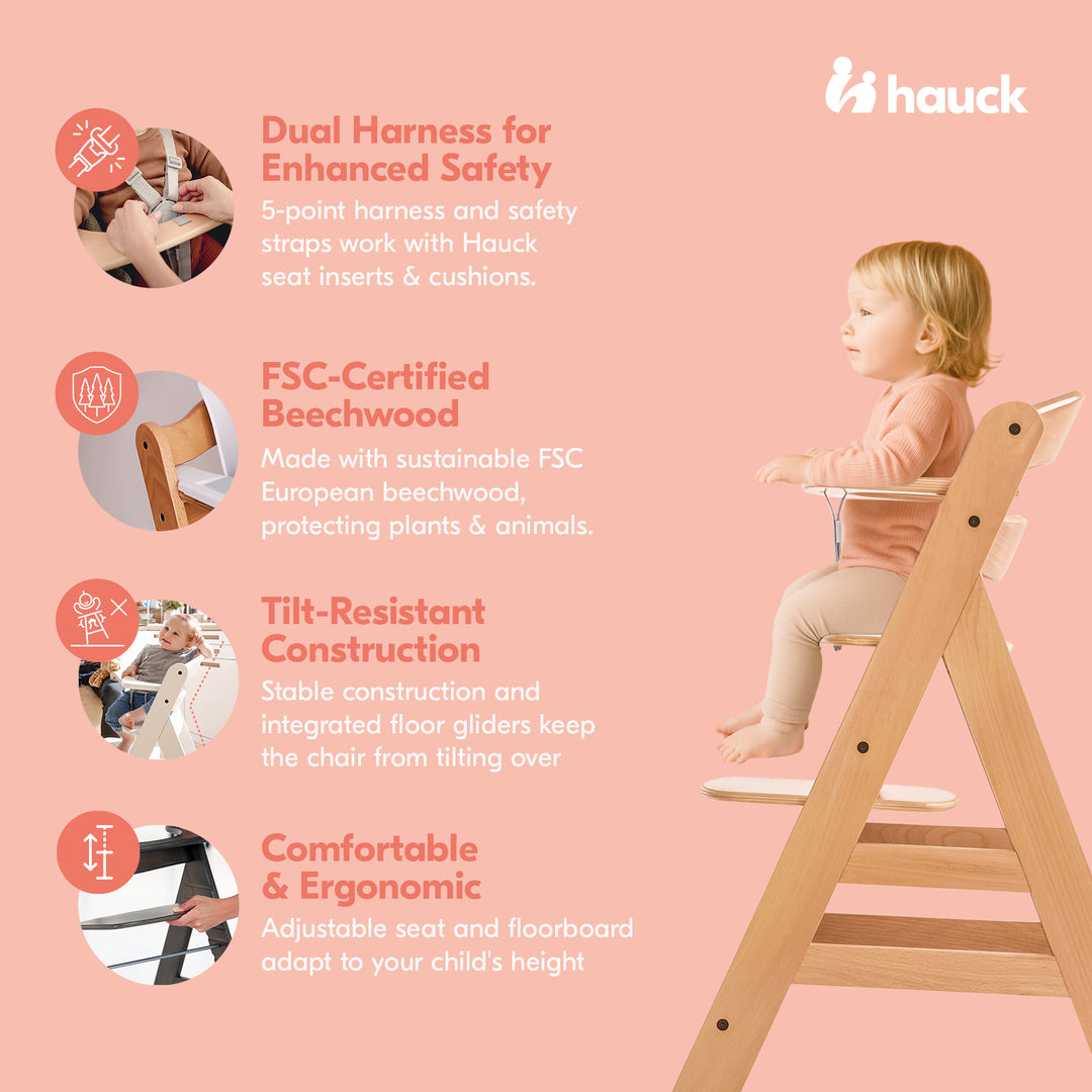 Make mealtime extra special by having your little ones dine safely with the hauck Alpha+ Grow Along Wooden Highchair Seat with Tray Table & Deluxe Pad Cushion for babies aged 6 months and above.