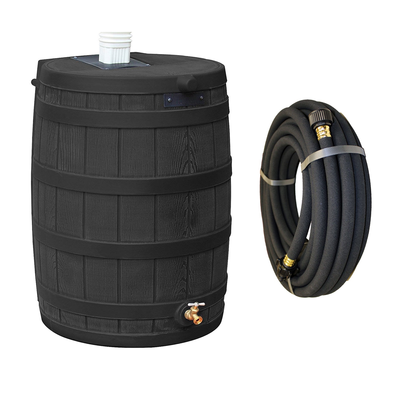 Good Ideas Rain Wizard 50 Gallon Plastic Rain Barrel, Black with 50' Soaker Hose