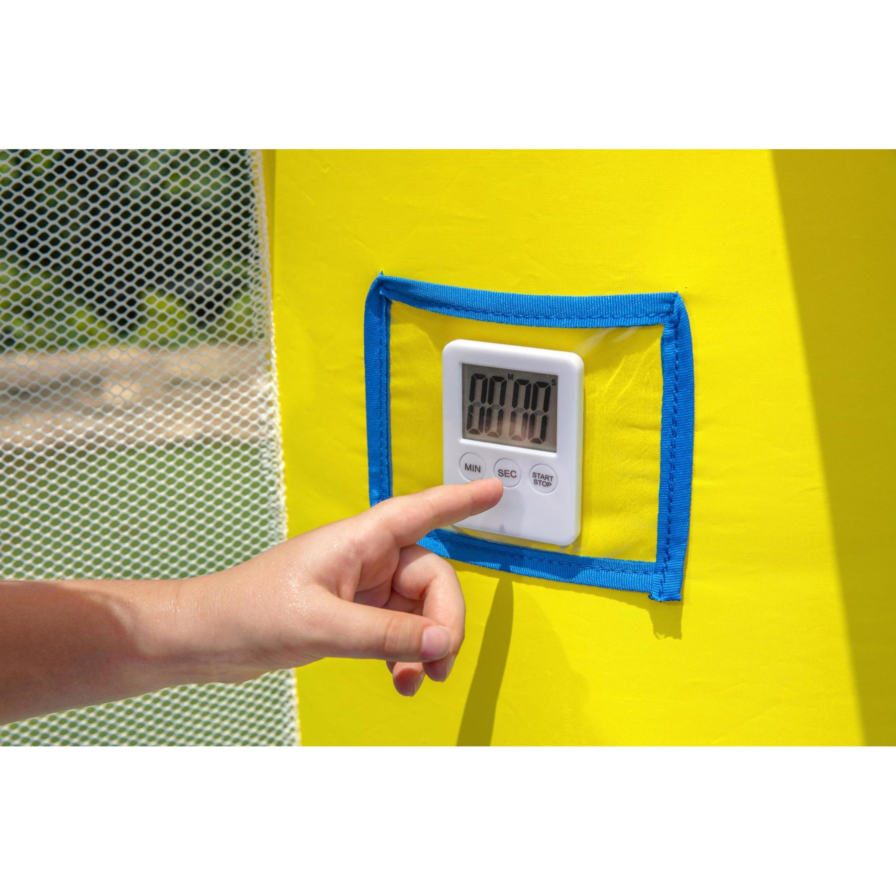 - 1 bouncer, 1 blower (stakes included), 1 repair kit (multiple assorted patches), 1 storage bag, 1 digital timer, 9 bouncer stakes