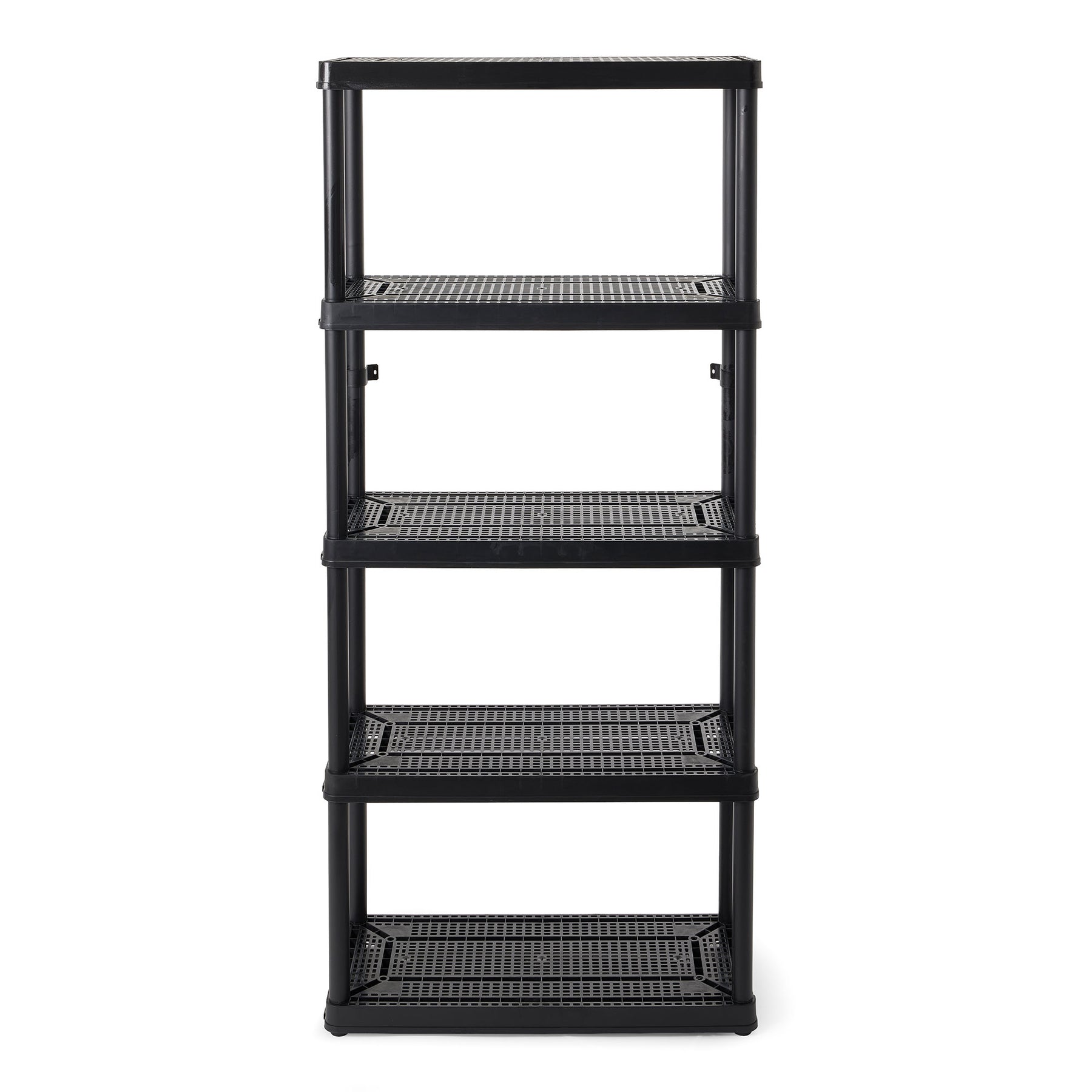 This bathroom storage shelf showcases timeless elegance for functional spaces with its lightweight, plastic construction and sleek color. Easily snap together for a simple installation process, and interconnect with additional units side-by-side for more storage space. Each solid shelf supports up to 100 pounds, providing a 500-pound unit capacity overall. Make sure that you distribute the weight evenly on the shelves for optimal, lasting use. With the 5 fixed shelves, you can organize laundry supplies, seasonal clothing items, home decor, toys, crafts, or tools. The closet storage shelf measures 14 inches long, 32 inches wide, and 72 inches tall offering a storage solution for any room. For added versatility, you can use the included brackets to mount the plastic shelves to the wall.