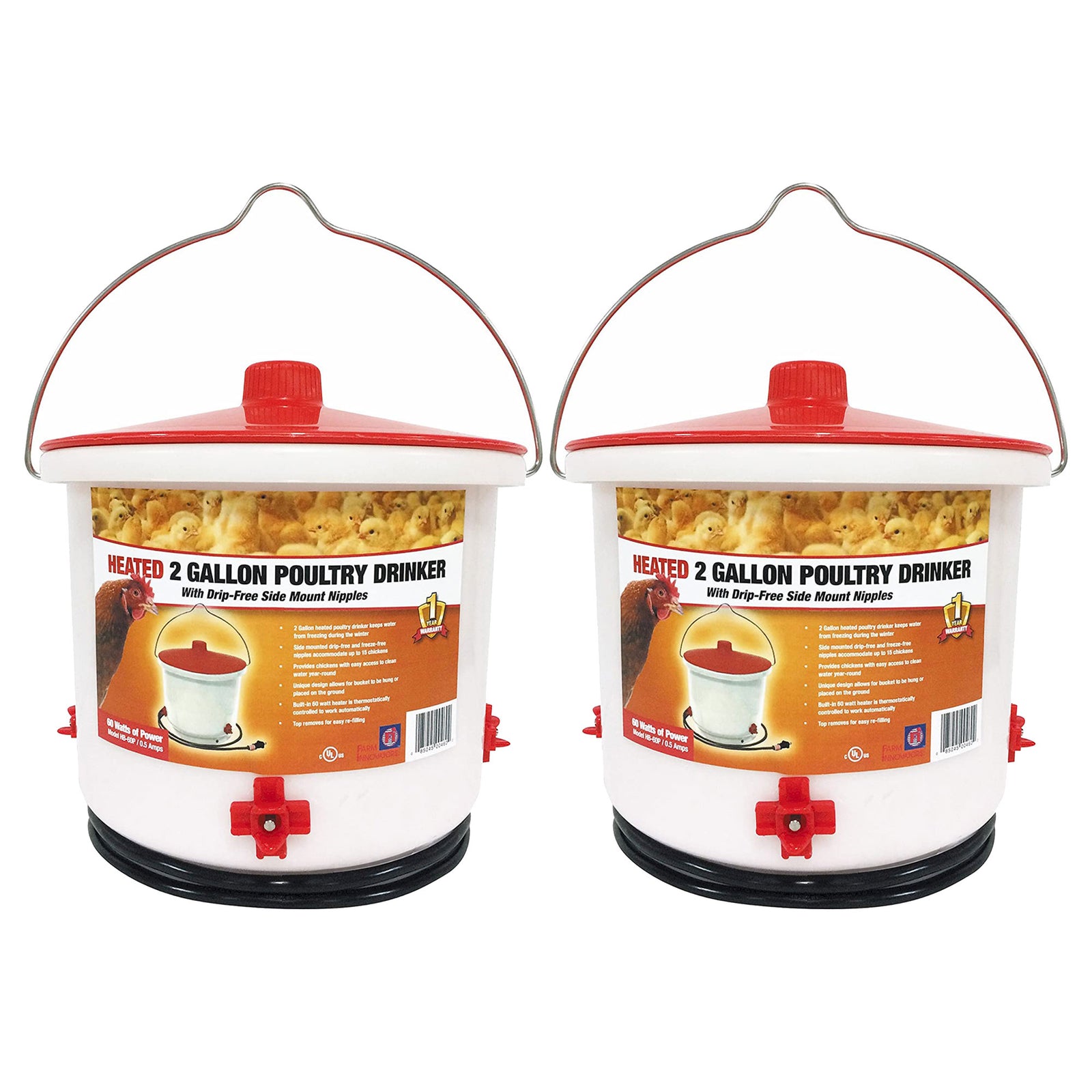 - Set of (2) heated water drinkers that prevent water from freezing in subzero temperatures so your chicken can have clean water year-round