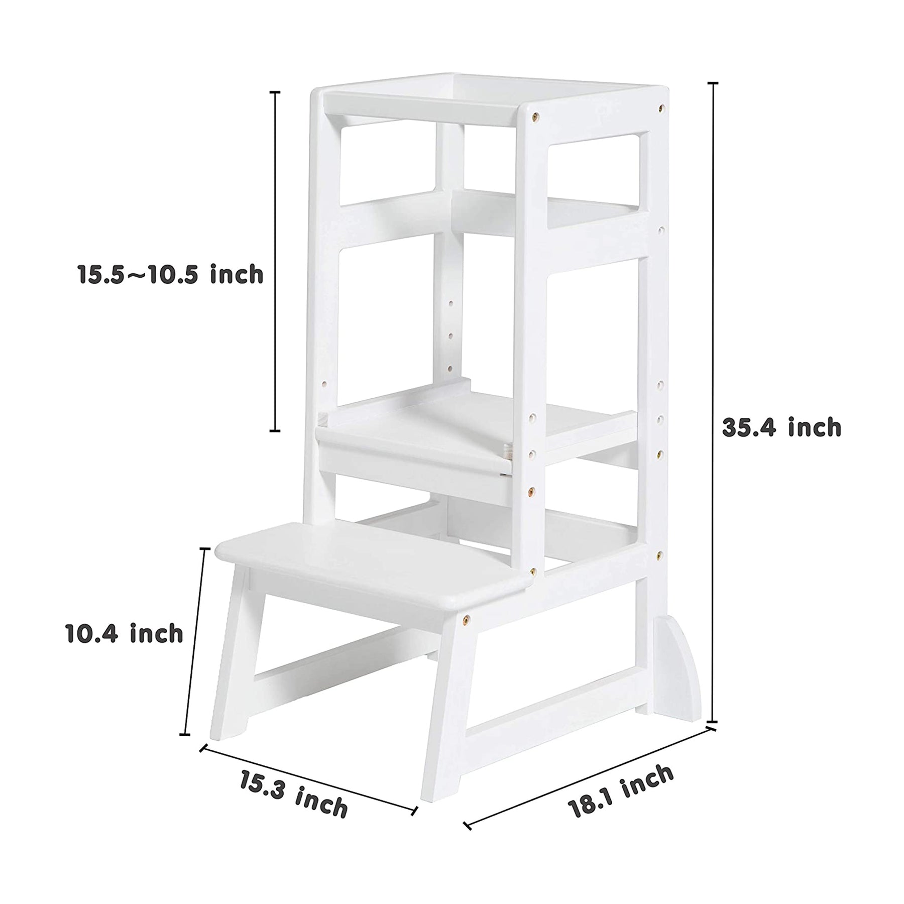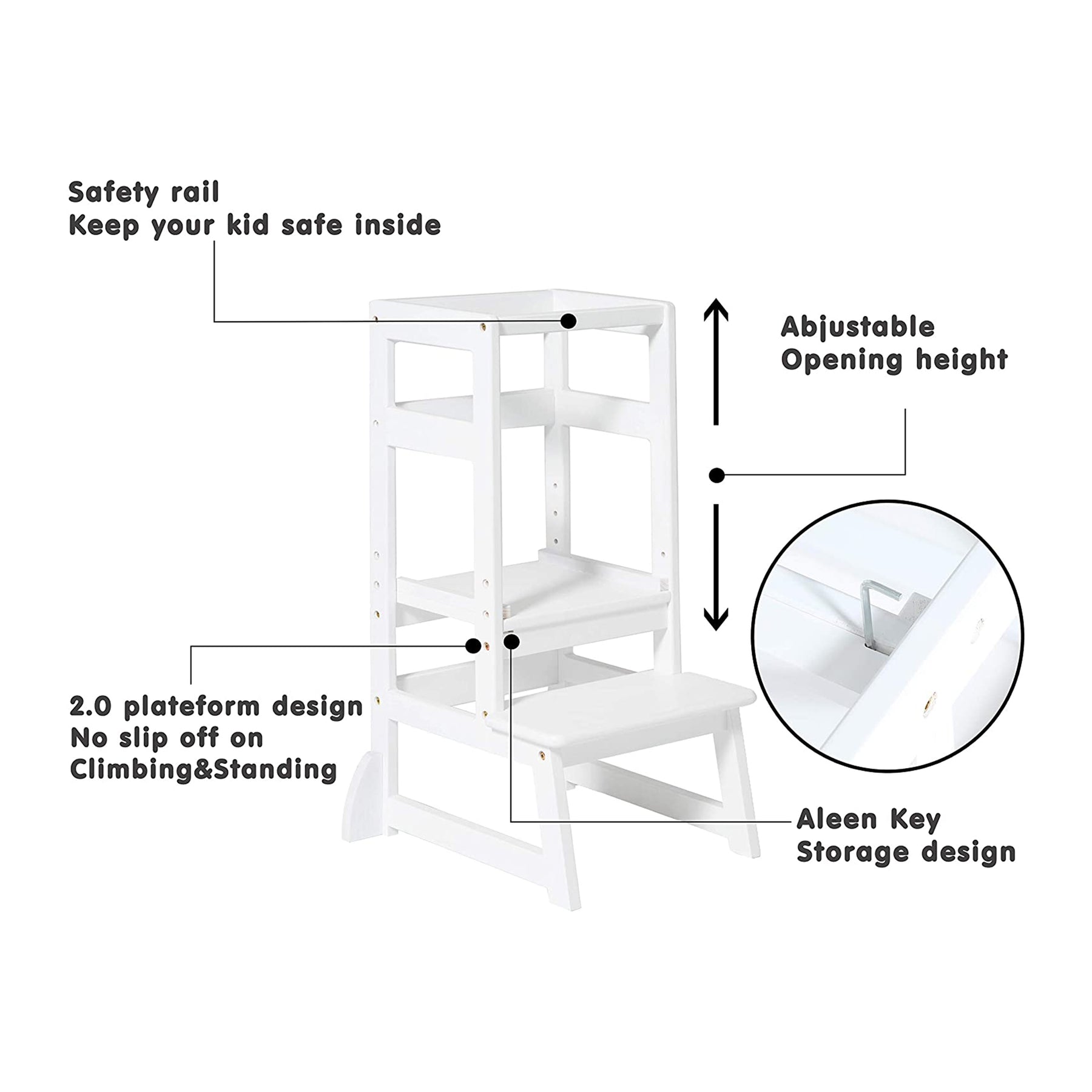 Your little tot will have lots of fun as they grow with the adjustable stool. The height can be changed to accommodate children from 1 to 3 years of age, and the 4-sided railings ensure they stay safe as they use the stool. Great for learning in the kitchen, the stool can also be used to reach the sink in the bathroom. Built from solid wood that supports up to 150 pounds and coated in a non-toxic, lead free coating, the ladder is perfectly safe for your baby. Further safety is provided by attachable, anti-slip strips for the 4 legs that hold the platform in place.
