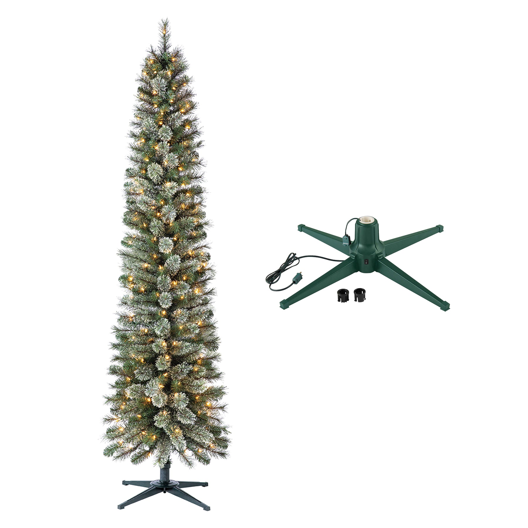 - This holiday bundle includes a high-quality rotating Christmas tree stand and the Home Heritage Stanley Skinny Pencil Pine Pre-Lit Artificial Christmas Tree