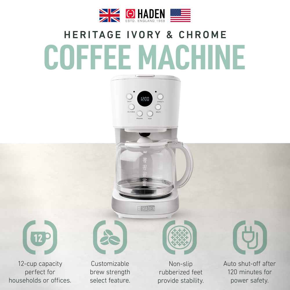 Haden Chelsea 10 Cup Digital Drip Coffee Maker with Glass Carafe, Ivory & Chrome