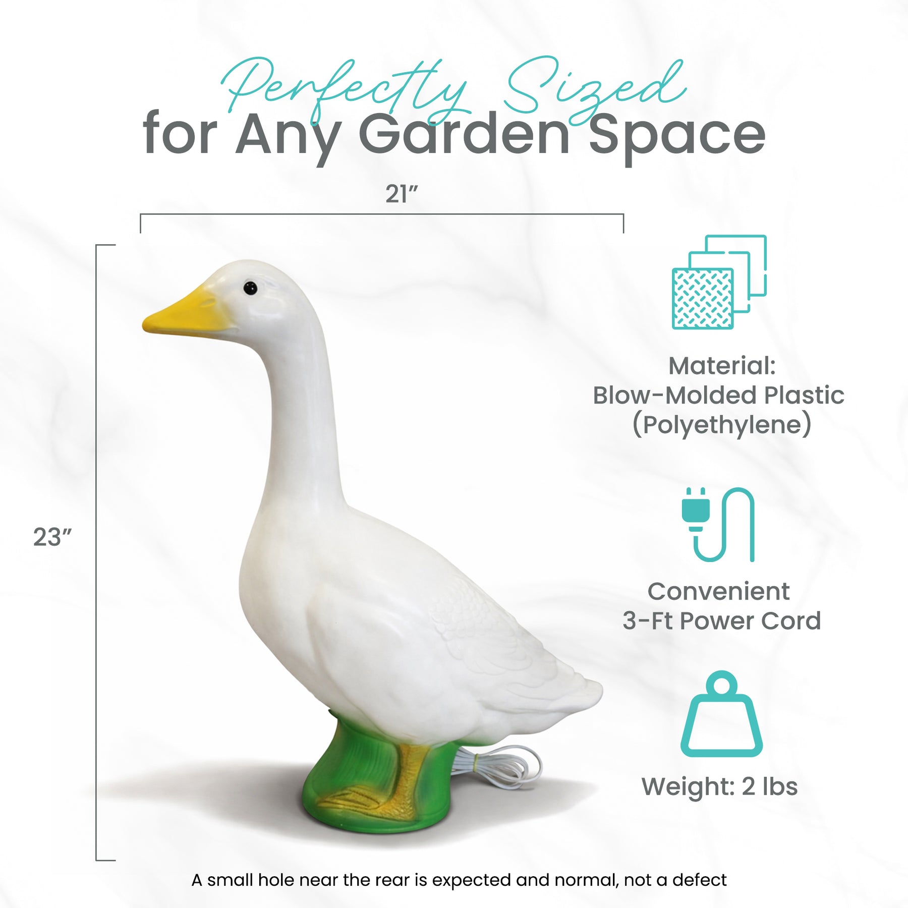 • Decorative 23" tall light up white goose statue adds whimsy and warmth to gardens, patios, entryways, classrooms, and bay windows; suitable for indoor or protected outdoor use