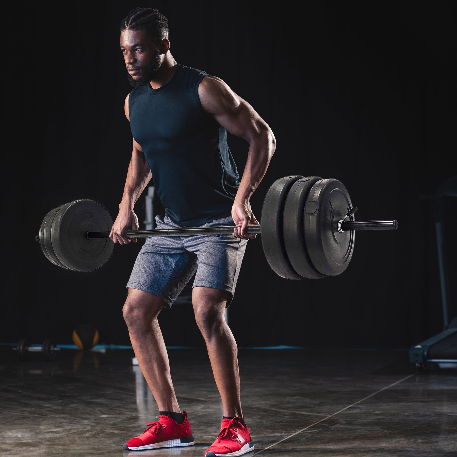 This Olympic-quality barbell is built for standard strength training and weight lifting routines such as squats, shoulder and bench presses, bent-over rows, and more. Chrome-plated and constructed from steel alloy, this solid weightlifting bar lasts through the most intense workouts without signs of wear and tear. Textured handles offer a secure grip, keeping your hands from slipping off. Knurled material with multiple positions and lengths offers the convenience needed for a comfortable, convenient, and safe workout. Since the bar and ends aren't built or attached separately, this allows for a single, whole design that's long-lasting, as well as easy to pick up and use.