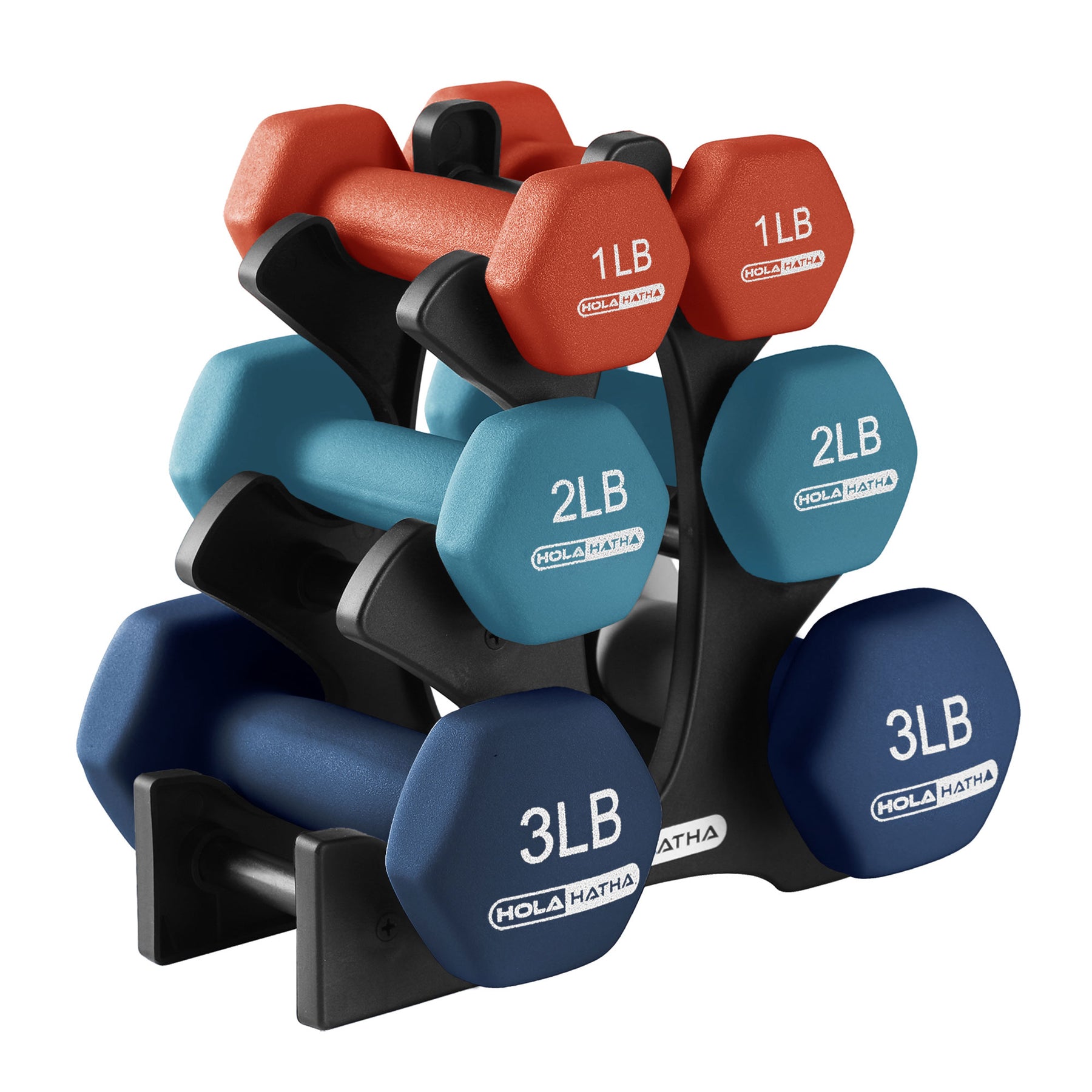 HolaHatha 1, 2 and 3 lb Neoprene Dumbbell Strength Training Weight Set with Rack