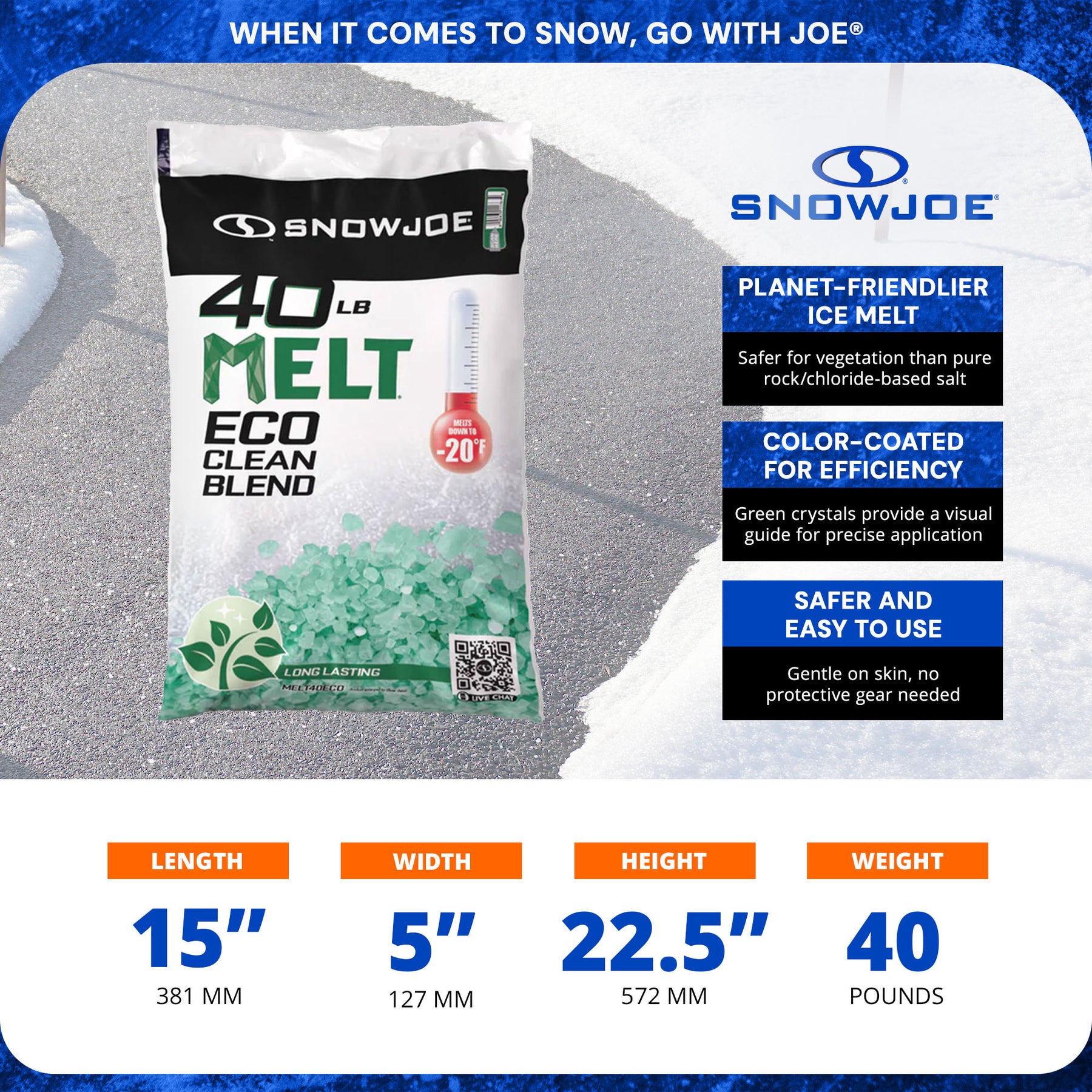 Designed for ease of use, MELT Eco Clean is gentle on the skin, eliminating the need for protective clothing. Featuring non-tracking crystals, this ice melt solution prevents stains and residue on floors, carpets, and footwear, keeping your indoor spaces clean after outdoor use. The green-coated crystals also provide a visual guide for precise application, making it cost-effective and reducing overuse. Perfect for use on driveways, sidewalks, roofs, and other outdoor surfaces, this 40-pound bag offers ample supply for winter snow and ice removal. Whether you’re clearing pathways or maintaining large outdoor areas, Snow Joe MELT40ECO delivers reliable, environmentally friendly results for a safer winter season.