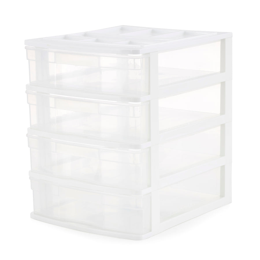 This desktop storage solution features 4 smooth-gliding drawers with handles for easy access to your items inside and a clear design for easily viewing and finding your items. With 4 drawers, you can use this plastic drawer unit as a makeup organizer, nail polish organizer, for small kitchen accessories, or for storing office desk accessories like pens and paperclips. The storage possibilities are endless! The handy 8.5 by 11-inch drawer provides convenience for your standard paper-sized supplies. Plus, the organizer lid keeps smaller items neatly in place helping to keep your desk clear of scattered items
