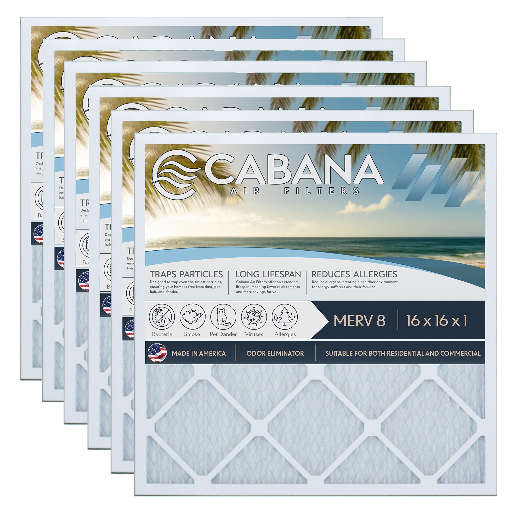Cabana Air Filters 6 Pack HVAC Furnace Air Filters, MERV 8, 16 x 16 x 1, White