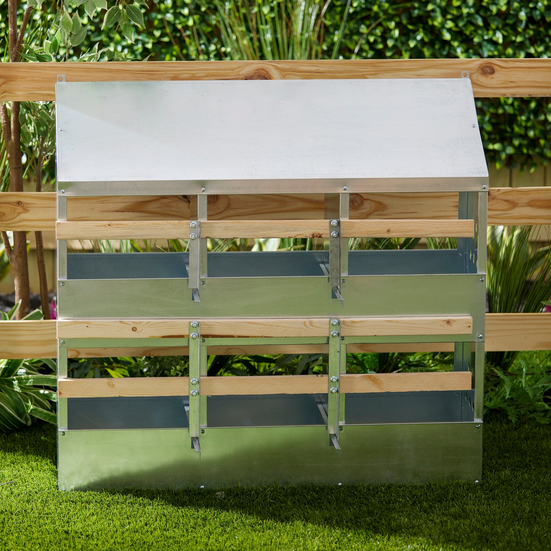 This pack of 2 poultry laying boxes is made from durable galvanized steel with folded edges for safety and a slanted roof to help keep your cluckers safe from the elements. The 6 bays provide room for up to 30 brooding hens and feature side ventilation holes for airflow. Stagger the nests back-to-back to prevent the hens from having full mobility if necessary. The outdoor hen house features double-bolted perches with hinged that allow them to be folded back easily as desired. Assembly and installation are made quick and easy with the included instructions. Setup takes under an hour and only requires a screwdriver and wrench; no rivet gun is necessary.