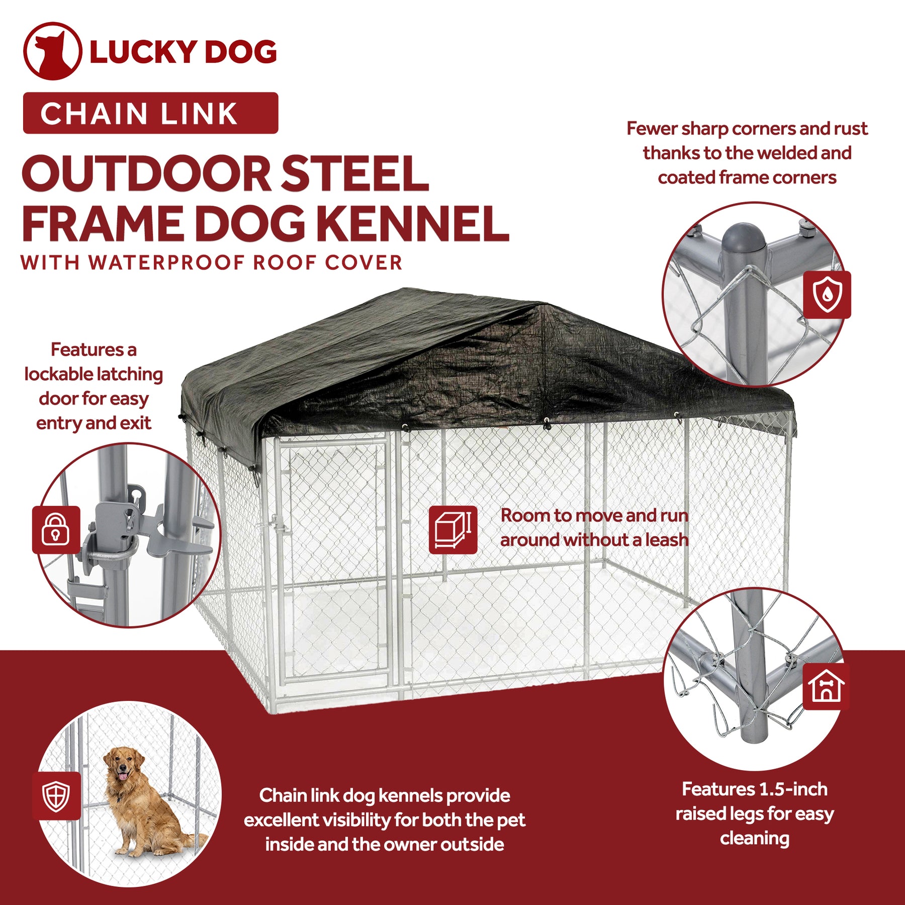 Lucky Dog 10 x 10 Ft Outdoor Steel Chain Link Dog Kennel & Waterproof Roof Cover