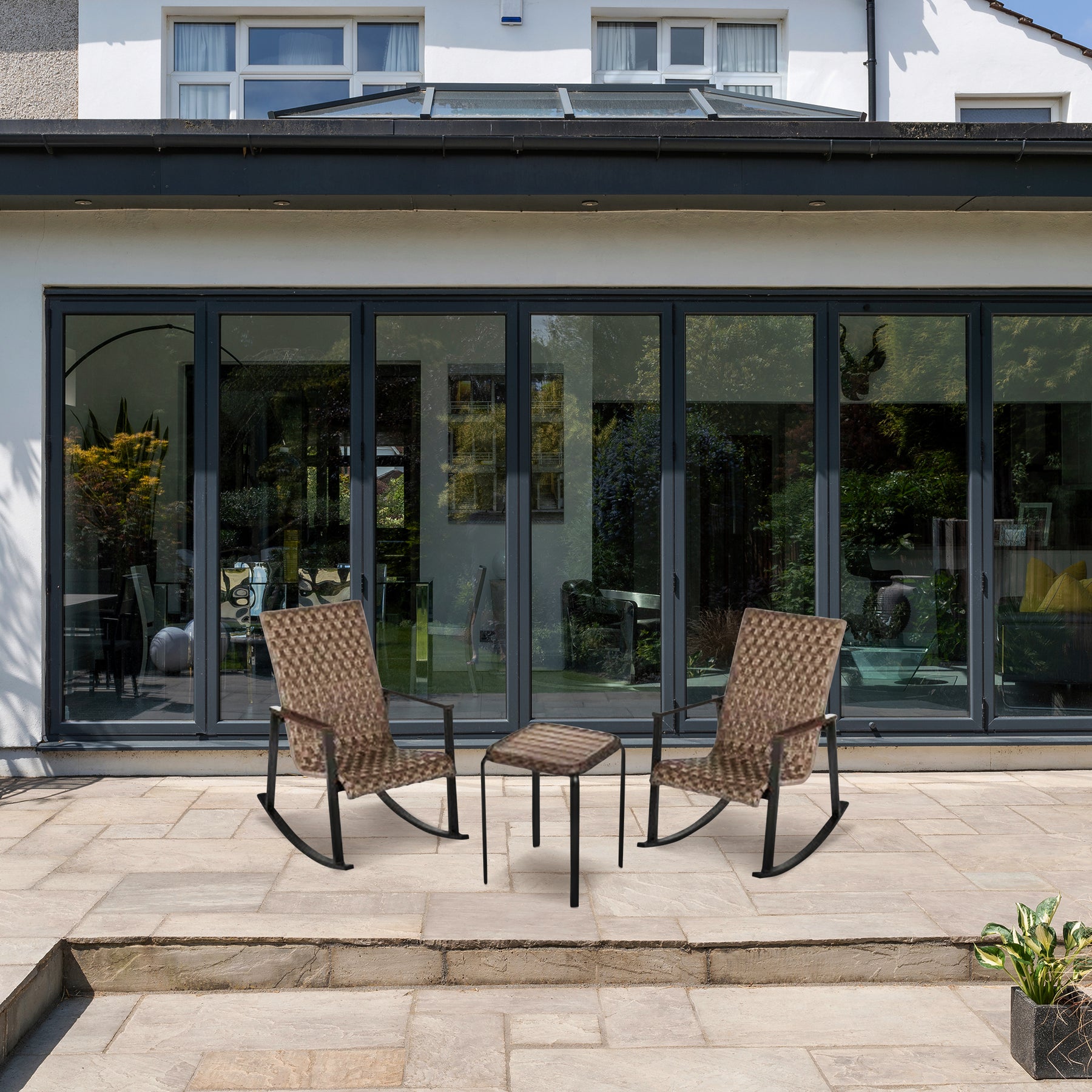 - Comes with 2 generously sized rocking chairs and a perfectly matched chat table that creates an ideal setting for intimate outdoor gatherings