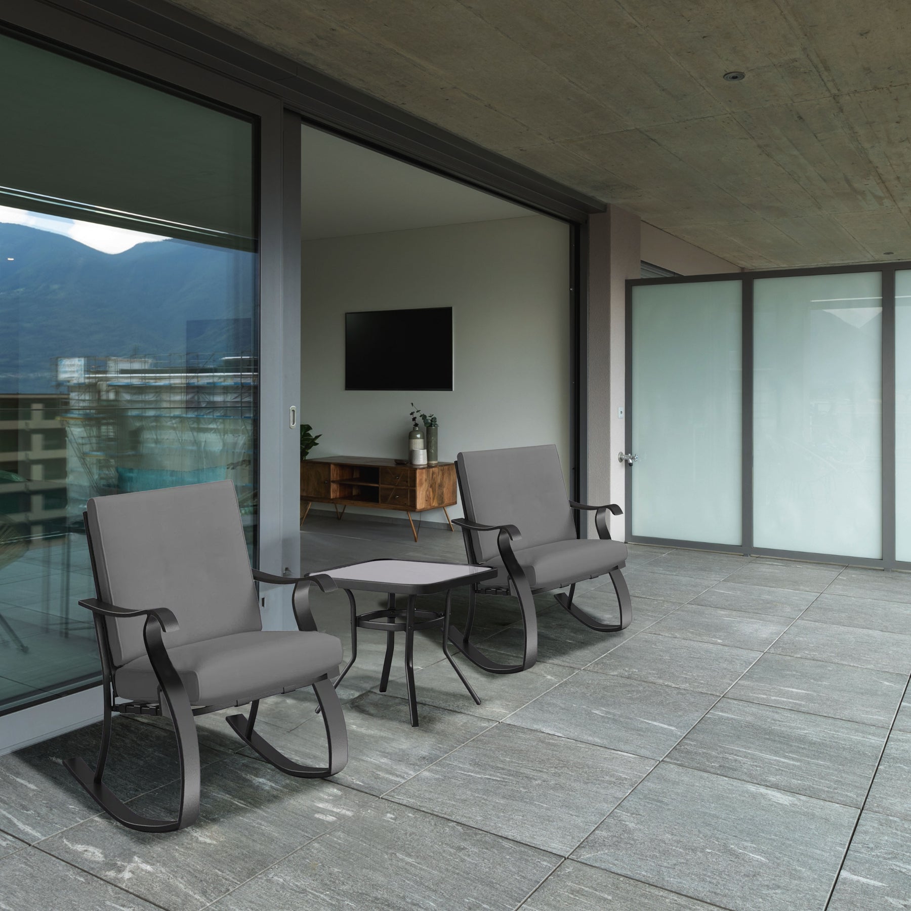 - Rocking bistro set featuring 3 pieces with a sleek charcoal gray finish to transform your outdoor space into a stylish retreat with a modern touch