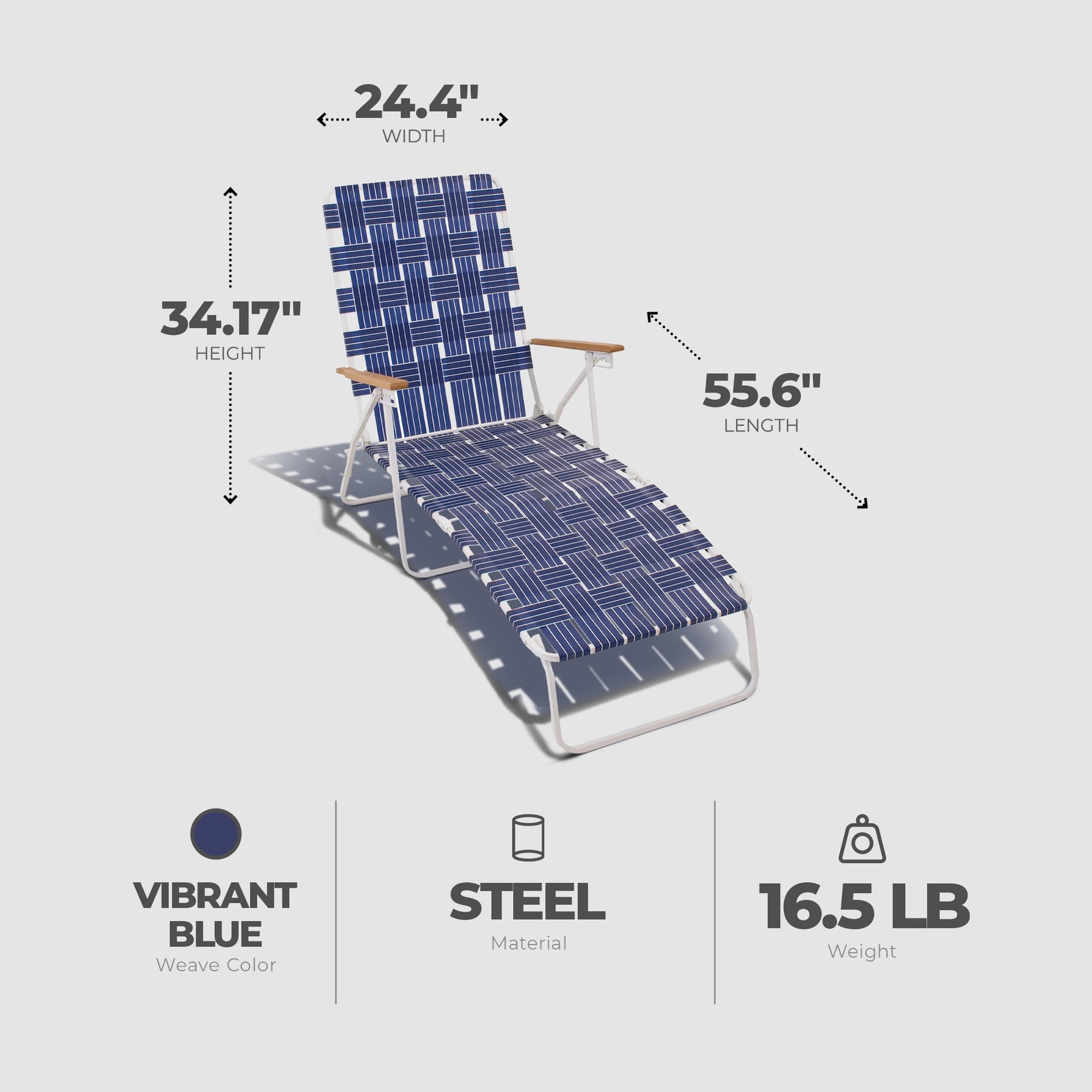 Meticulously crafted to deliver both comfort and durability, this folding lounge chair showcases an elegant white powder-coated steel frame beautifully complemented by vibrant blue woven webbing. Designed with paramount comfort in mind, it features hardwood arms for enhanced support and visual appeal, while its substantial weight capacity of 240 pounds ensures unwavering reliability for endless moments of relaxation. Providing a generous seating area with dimensions of 10.5 inches in seat height, 21.25 inches in seat width, and 42.5 inches in seat depth, it offers ample space for lounging, providing unparalleled comfort and lumbar support. Additionally, boasting assembled dimensions of approximately 30.12 inches in length, 8.27 inches in width, and 26.18 inches in height. Ideal for a myriad of outdoor settings including the beach and poolside, this lounge chair promises to be the ultimate companion for indulging in the sun's warmth and tranquility.