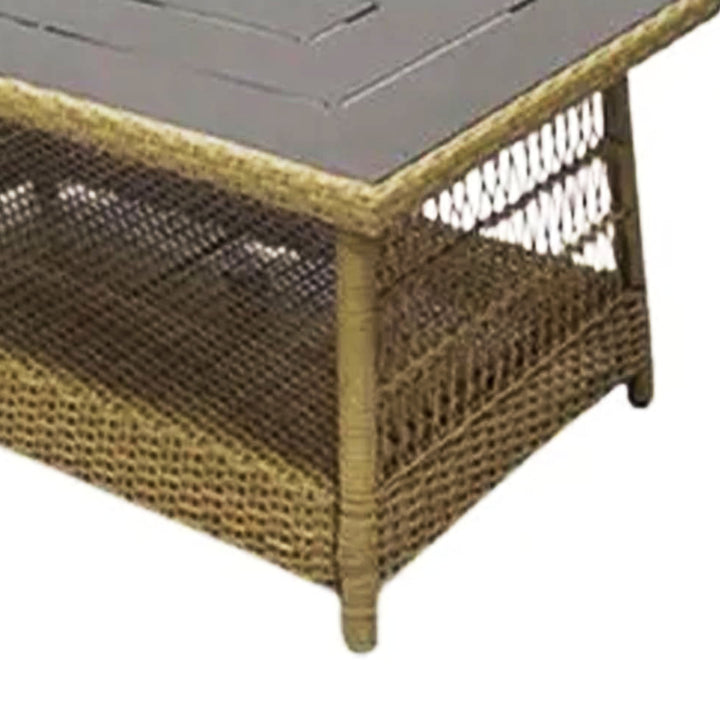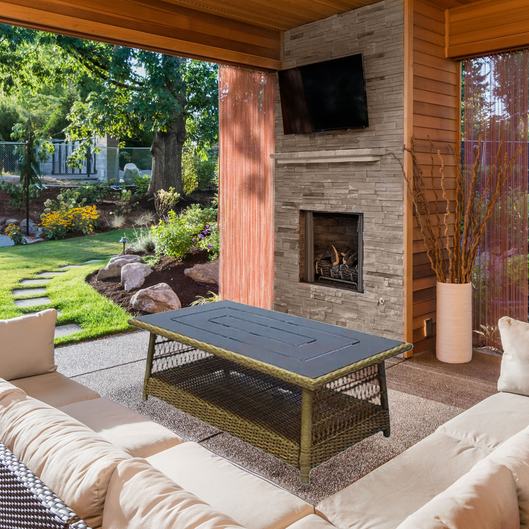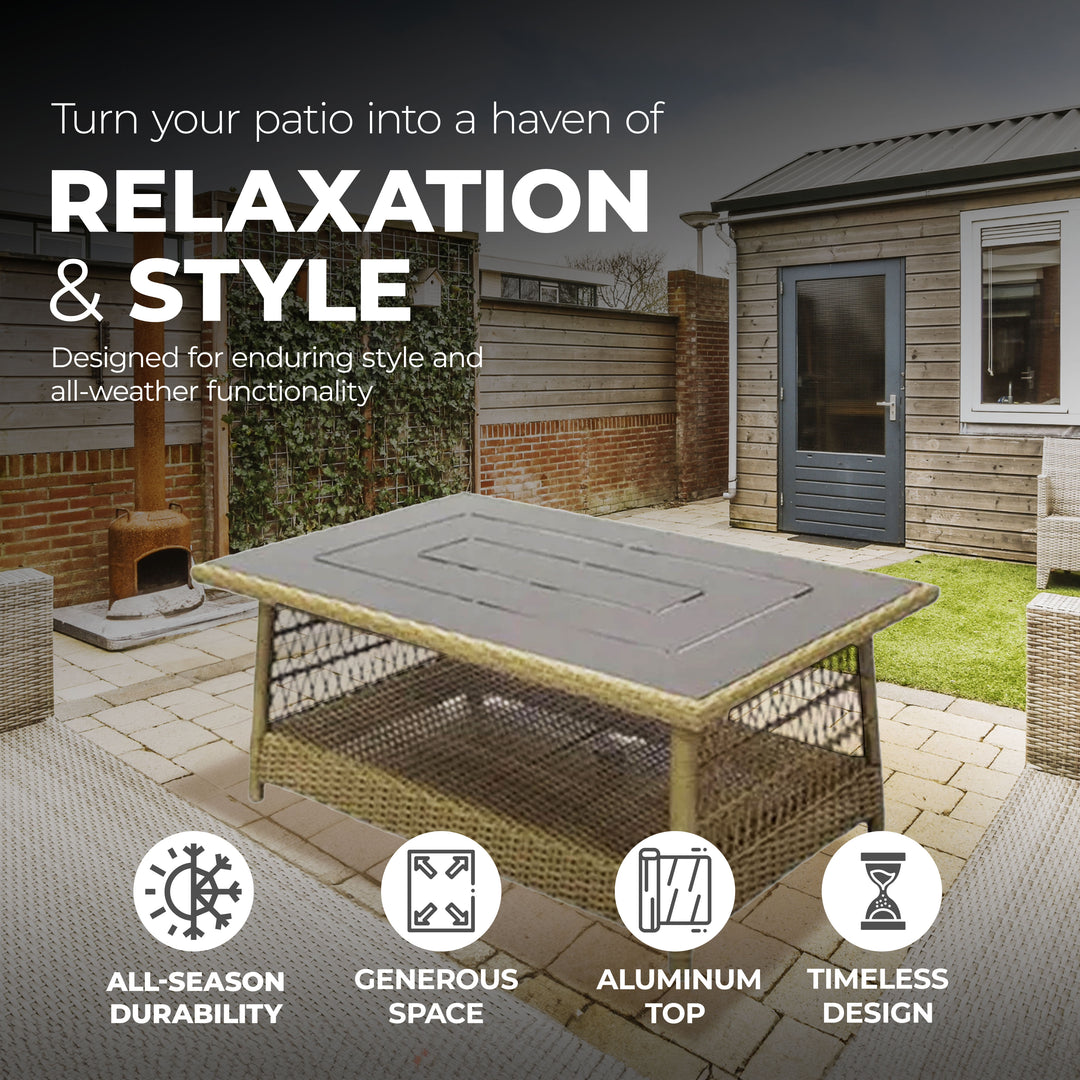 Crafted with a powder-coated steel frame, this outside coffee table ensures longevity and robustness, withstanding the test of time and the rigors of various weather conditions. The all-weather open weave wicker design, coupled with an elegant aluminum decorative top, exudes sophistication while offering practicality for outdoor use. This thoughtful combination of materials not only enhances the table's aesthetic appeal but also ensures resilience against the elements, making it an ideal choice for year-round enjoyment.