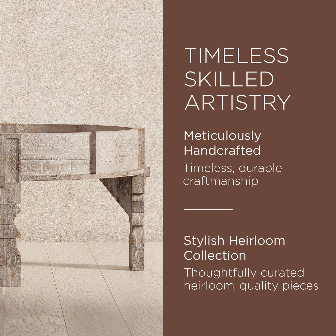 With a rich history and cultural significance, the hand-carved elements of our Jaya Round Coffee Table are intricate and beyond incredible. Transcending time with its hand-carved façade, spacious round tabletop, and metal accents, this large wood coffee table embodies the joy of owning bespoke creations crafted with love, passion, and expertise – a true testament to India’s legacy of extraordinary artistry. The warm tones and wood grain of the natural mango wood are a sight to behold, and the distressed wooden finish of our Jaya living room tables will give your space that one-of-a-kind, curated vibe. Simply style this cocktail table— and let this wooden table’s divine design do all the talking.