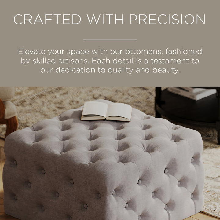 Timeless and tufted, our traditionally styled, well-made Henry Square Upholstered Ottoman Footrest aims to heighten your living room seating furniture aesthetic. Boasting button-tufting in a diamond pattern with button accents and a sophisticated square silhouette, this cube ottoman seat is simply swoon-worthy. Pair this tufted ottoman pouf with your contemporary, modern, or traditional bedroom or dorm room furnishings and let its versatility shine through. Featuring head-to-toe premium fabric upholstery in a gorgeous medium hue, and a high-density padded foam cushion, this footstool is beaming with classic charm. Along with utilizing exceptional materials and solid kiln-dried hardwood, our quality furnishings offer conscientious craftsmanship to last a lifetime. At Maven Lane, our well-made home furniture is meticulously handcrafted with methods to stand the test of time including hand finishes displaying an impeccable attention to every small detail, and sturdy mortise-and-tenon joinery techniques which promote strength and longevity. Furthermore, by utilizing premium materials and kiln-dried hardwood in our solid wood furniture, we’ve solidified the superiority of craftsmanship you’ve come to expect from Maven Lane. Be sure to view the other pieces in our furniture collection. We've carefully curated an entire medley of heirloom-quality pieces that can be mixed and matched to create the aesthetic your home has been seeking. Given the handmade nature of our products, minimal variations may occur in color, tone, and wood finish.