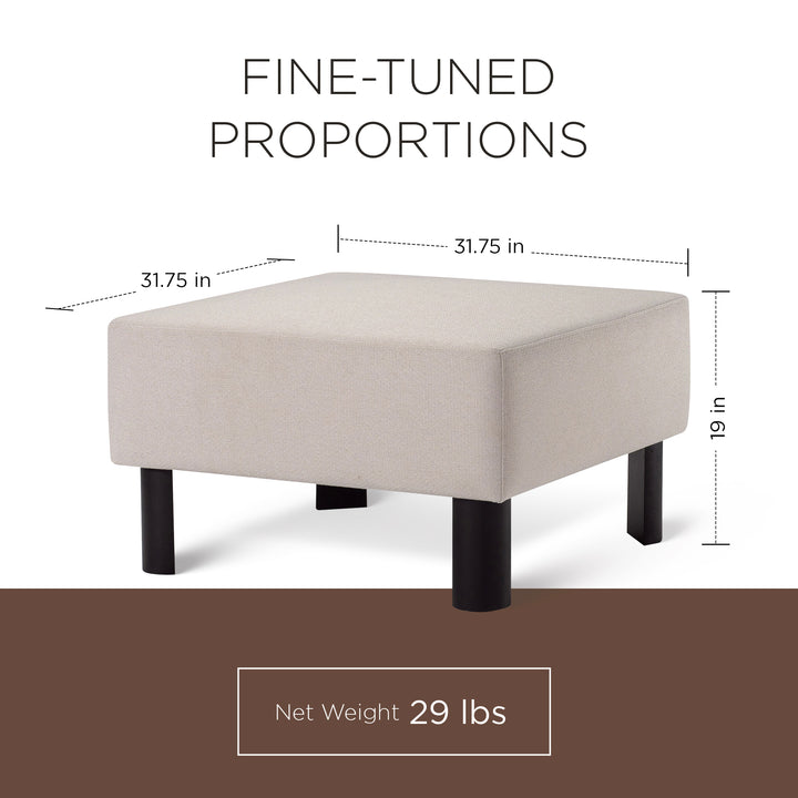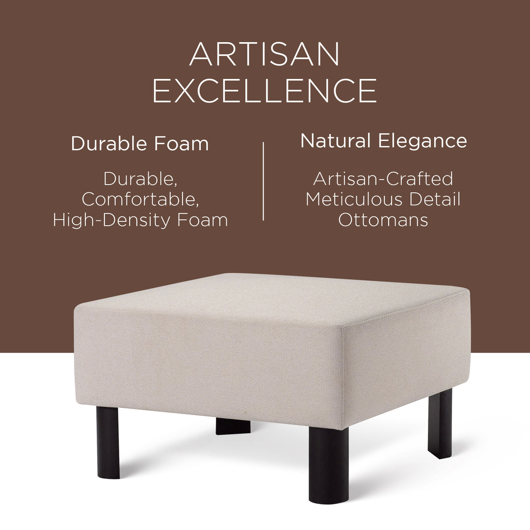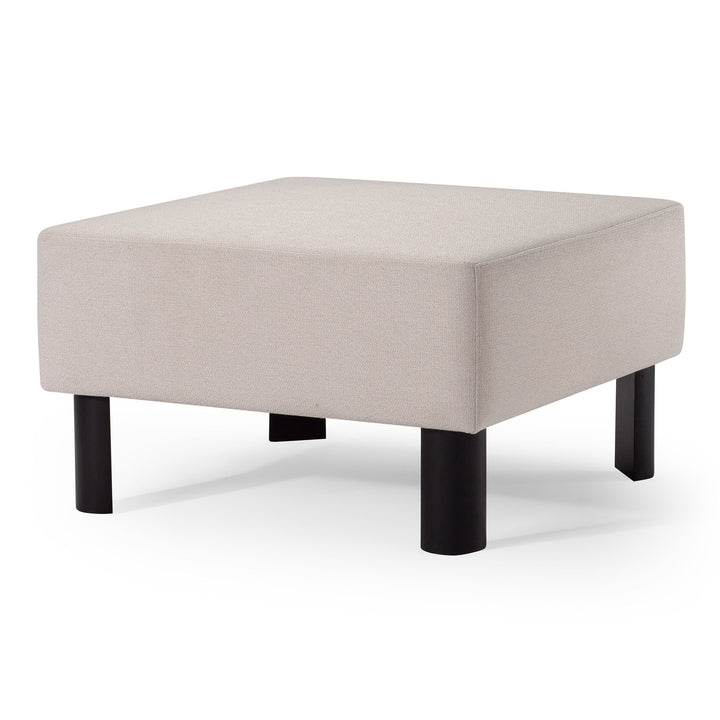 - Lena Upholstered Ottoman features a low, sleek profile, a square footprint, solid wooden legs, and premium fabric upholstery, ideal for any home space