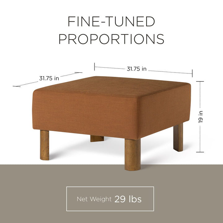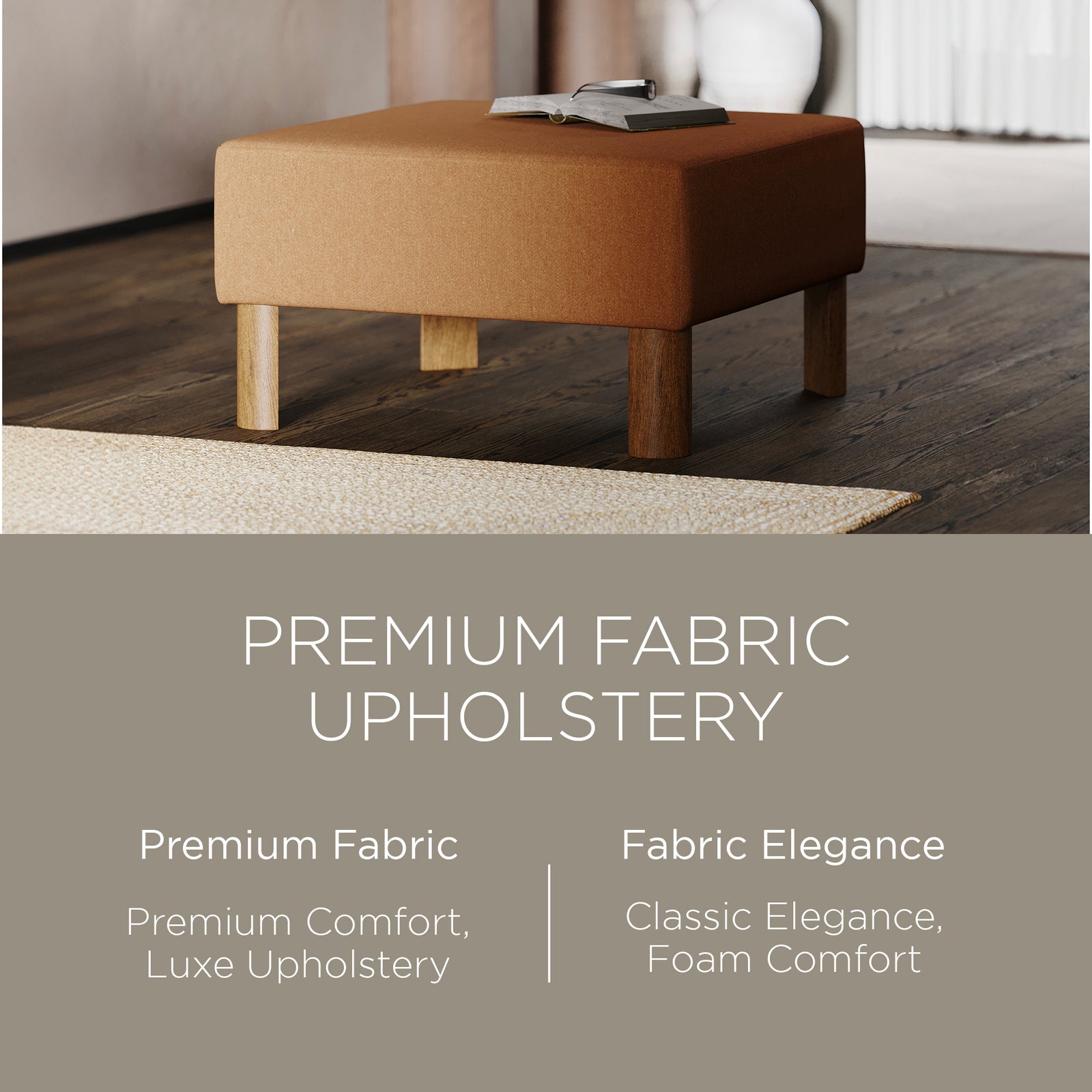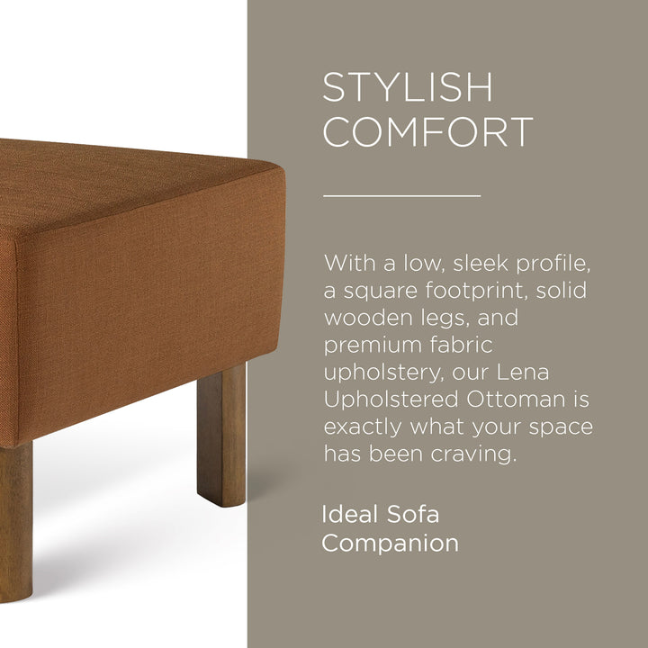 - Lena Upholstered Ottoman features a low, sleek profile, a square footprint, solid wooden legs, and premium fabric upholstery, ideal for any home space