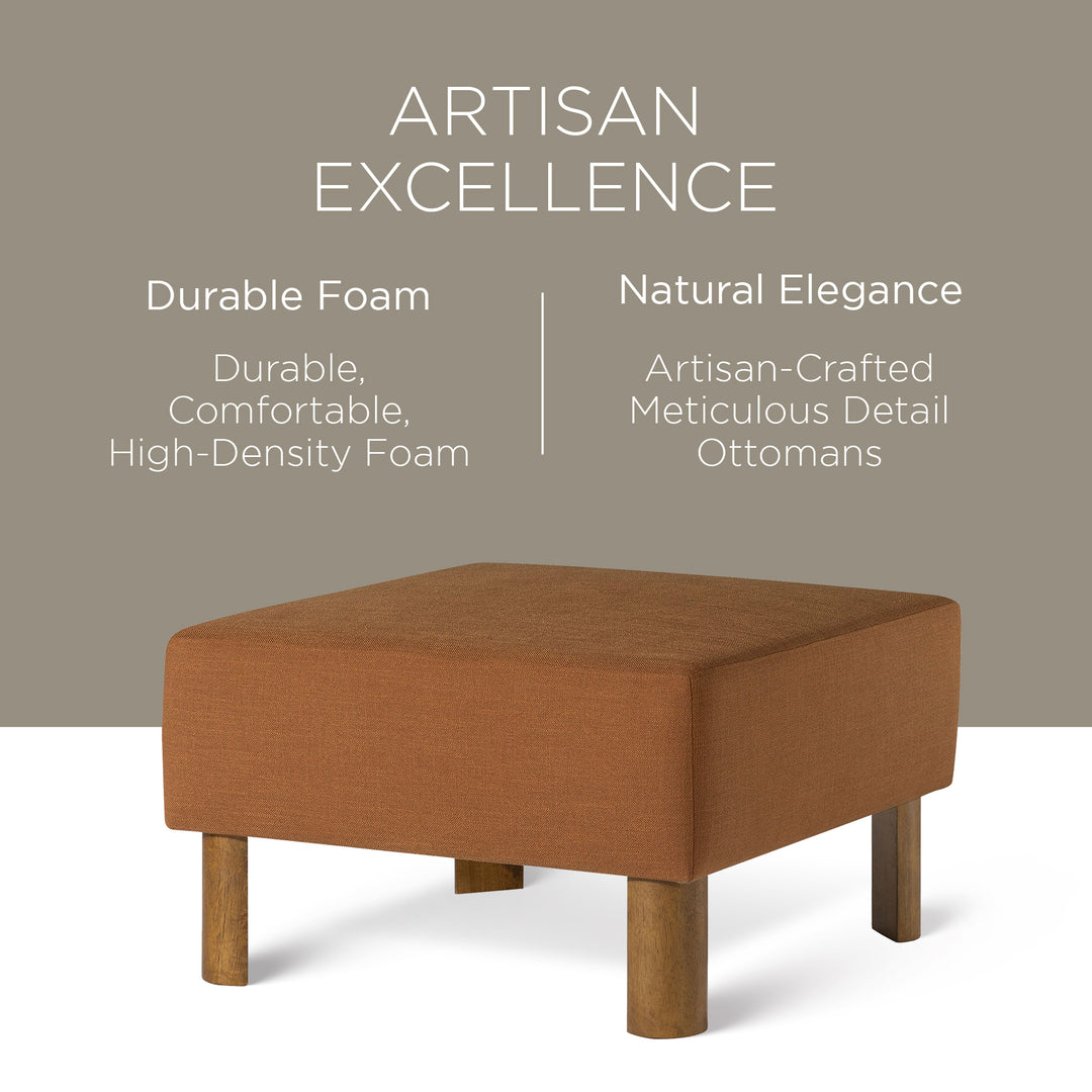 Exceedingly well-made and brimming with warmth and grace, our quality Lena Upholstered Ottoman Footstool is yearning to join your bedroom, den, or living room seating furniture family. Featuring premium fabric upholstery in a gorgeous medium hue, a high-density padded foam cushion, and modern, solid wooden block legs in a neutral shade, this footrest ottoman cube begs to be your loveseat, chair, or couch’s newest and best companion. When used in place of a coffee table, this decorative upholstered flat-top ottoman can easily be styled with your favorite manuscripts yet looks effortlessly elegant if left au naturel. Along with utilizing premium materials and solid kiln-dried hardwood, our sturdy furnishings offer conscientious craftsmanship to last a lifetime. At Maven Lane, our well-made home furniture is meticulously handcrafted with methods to stand the test of time including hand finishes displaying an impeccable attention to every small detail, and sturdy mortise-and-tenon joinery techniques which promote strength and longevity. Furthermore, by utilizing premium materials and kiln-dried hardwood in our solid wood furniture, we’ve solidified the superiority of craftsmanship you’ve come to expect from Maven Lane. Be sure to view the other pieces in our furniture collection. We've carefully curated an entire medley of heirloom-quality pieces that can be mixed and matched to create the aesthetic your home has been seeking. Given the handmade nature of our products, minimal variations may occur in color, tone, and wood finish.