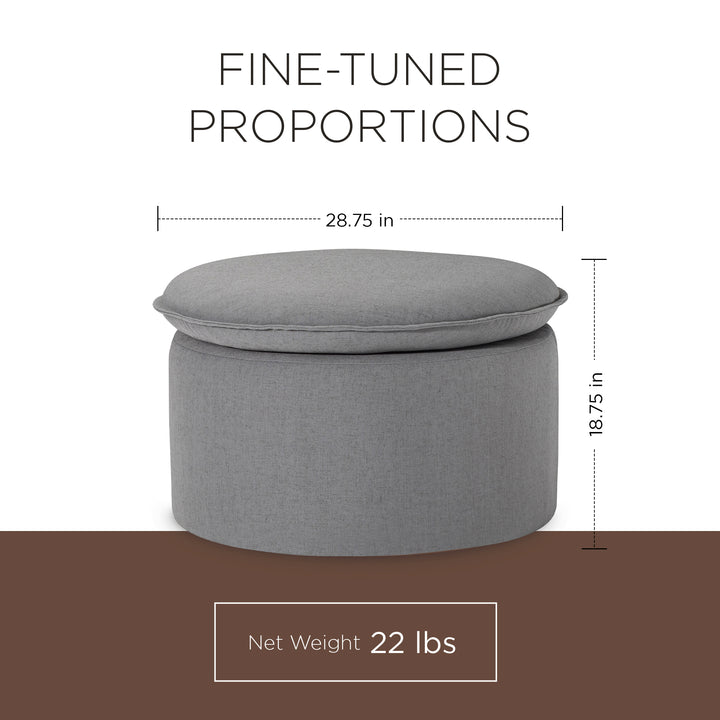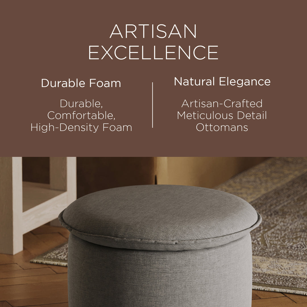 - For a timeless, monochromatic, and neutral look, this round ottoman is a must, the premium fabric and luxe feel of the upholstered ottoman will be an ideal addition