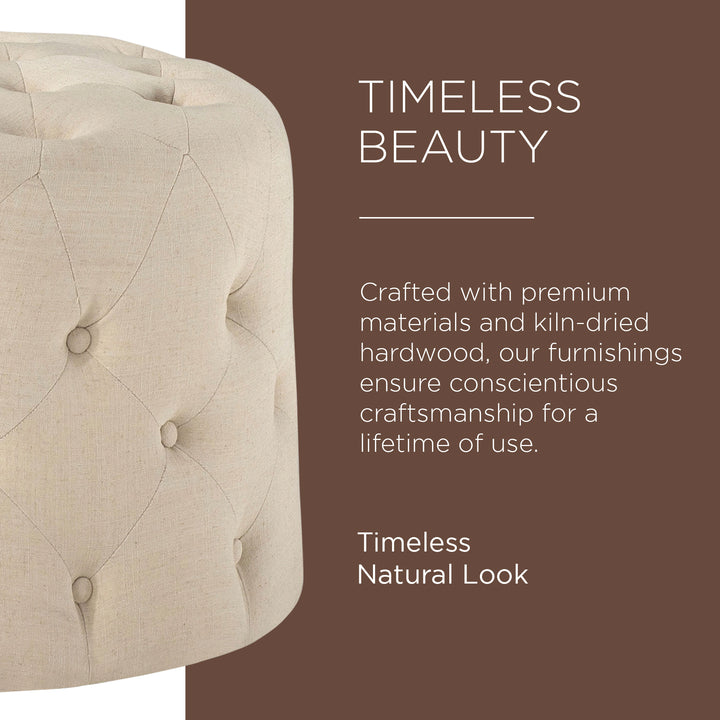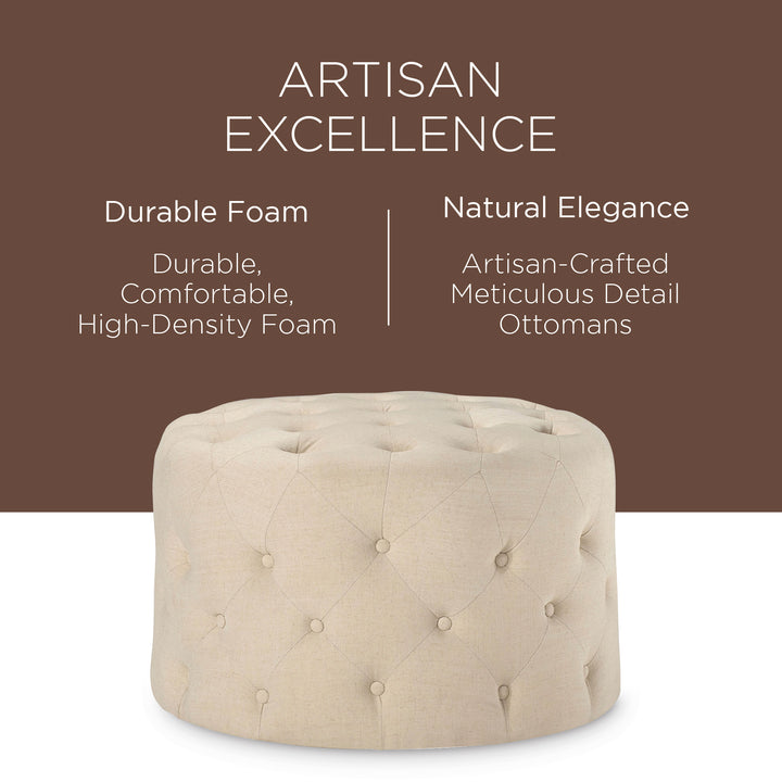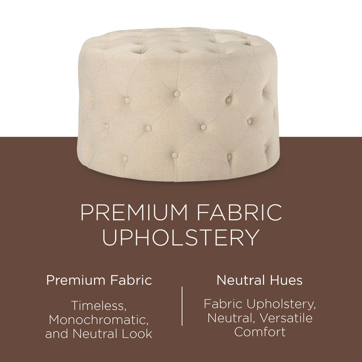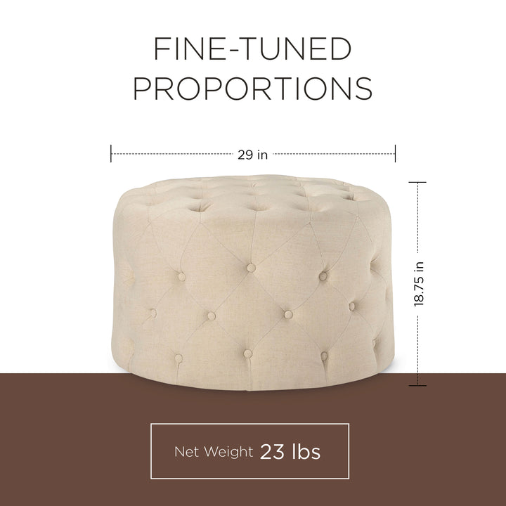 Beautifully button-tufted, our traditionally styled, well-made Marcy Round Upholstered Ottoman Footrest is the lavish, decorative piece that’ll help tie all of your living room seating furniture together flawlessly. Its timeless tufting in a diamond pattern with button accents and sophisticated circular silhouette is simply swoon-worthy. Pair this circle ottoman pouf with your contemporary, modern, or traditional bedroom or dorm room furnishings and let its versatility shine through. Featuring head-to-toe premium fabric upholstery in a gorgeous medium hue, and a high-density padded foam cushion, this tufted round ottoman is beaming with classic charm. Along with utilizing exceptional quality materials and solid kiln-dried hardwood, our quality furnishings offer conscientious craftsmanship to last a lifetime. At Maven Lane, our well-made home furniture is meticulously handcrafted with methods to stand the test of time including hand finishes displaying an impeccable attention to every small detail, and sturdy mortise-and-tenon joinery techniques which promote strength and longevity. Furthermore, by utilizing premium materials and kiln-dried hardwood in our solid wood furniture, we’ve solidified the superiority of craftsmanship you’ve come to expect from Maven Lane. Be sure to view the other pieces in our furniture collection. We've carefully curated an entire medley of heirloom-quality pieces that can be mixed and matched to create the aesthetic your home has been seeking. Given the handmade nature of our products, minimal variations may occur in color, tone, and wood finish.