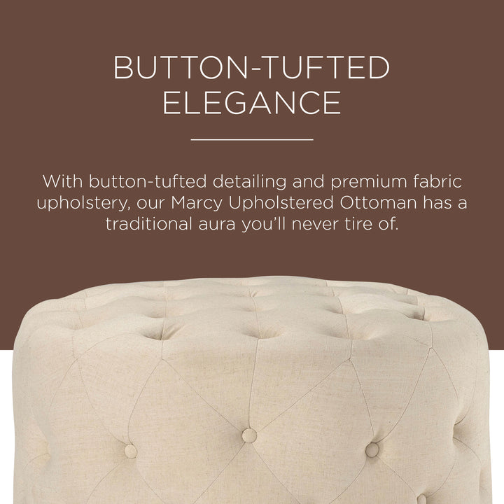 - Marcy Upholstered Ottoman has a traditional aura with button-tufted detailing and premium fabric upholstery for a timeless, neutral look furniture piece
