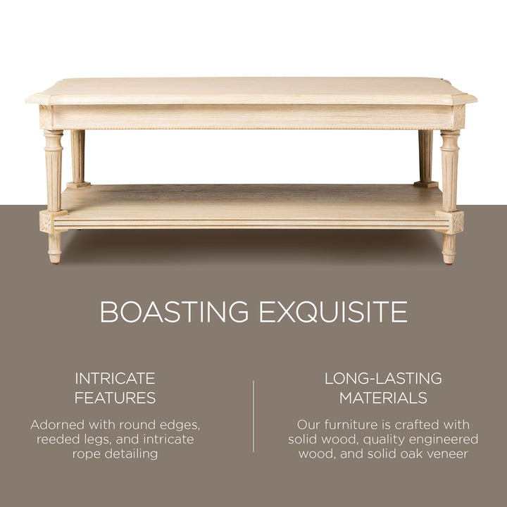 - Boasting exquisite, hand-carved details, including rounded table edges, intricate clipped corners, reeded legs, and carved rope detailing, this cocktail table elevates the sophistication level of your living room furniture tenfold