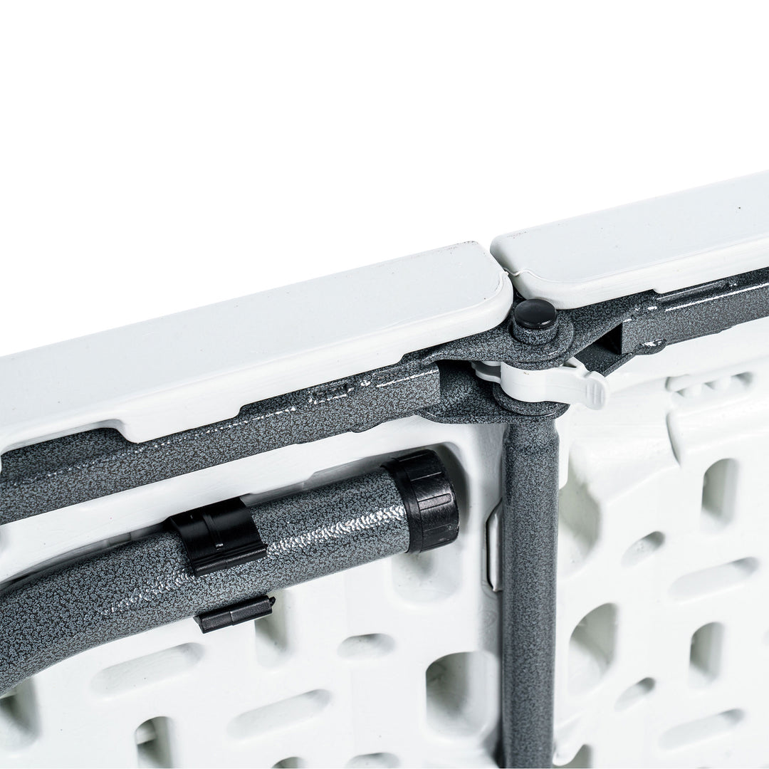 The table’s powder-coated steel frame guarantees support and stability, while its all-weather finish ensures easy cleaning and stain resistance. Foot caps provide extra protection for your floors, so you can confidently use it both indoors and outdoors. This table is designed to meet all your needs, whether you’re hosting a picnic, a party, or an impromptu gathering. It delivers a quick, spacious, and reliable surface every time, making it an essential addition to your home or event supplies.