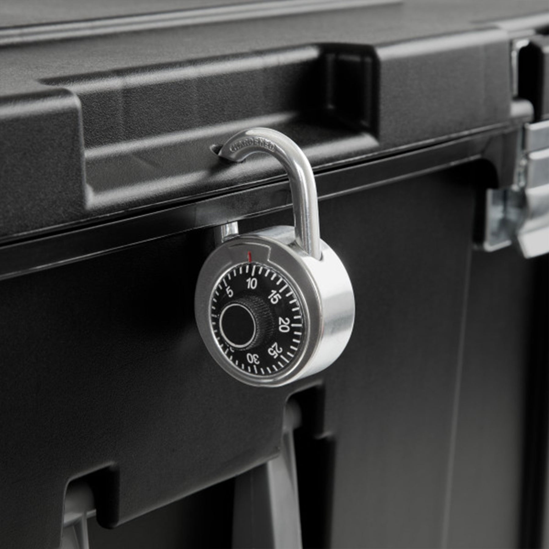 The smooth-rolling wheels and ergonomic handles allow for easier transporting of heavy loads, making these footlockers great companions for moving, or on-the-go living. Use the integrated side handles or the full grip bail style handle when carrying light loads. These footlockers utilize metal hinges and latches and accept a standard-size padlock for added security (not included). The overall assembled dimensions of each tote are 31.25 inches long x 17.60 inches wide x 13.70 inches high.