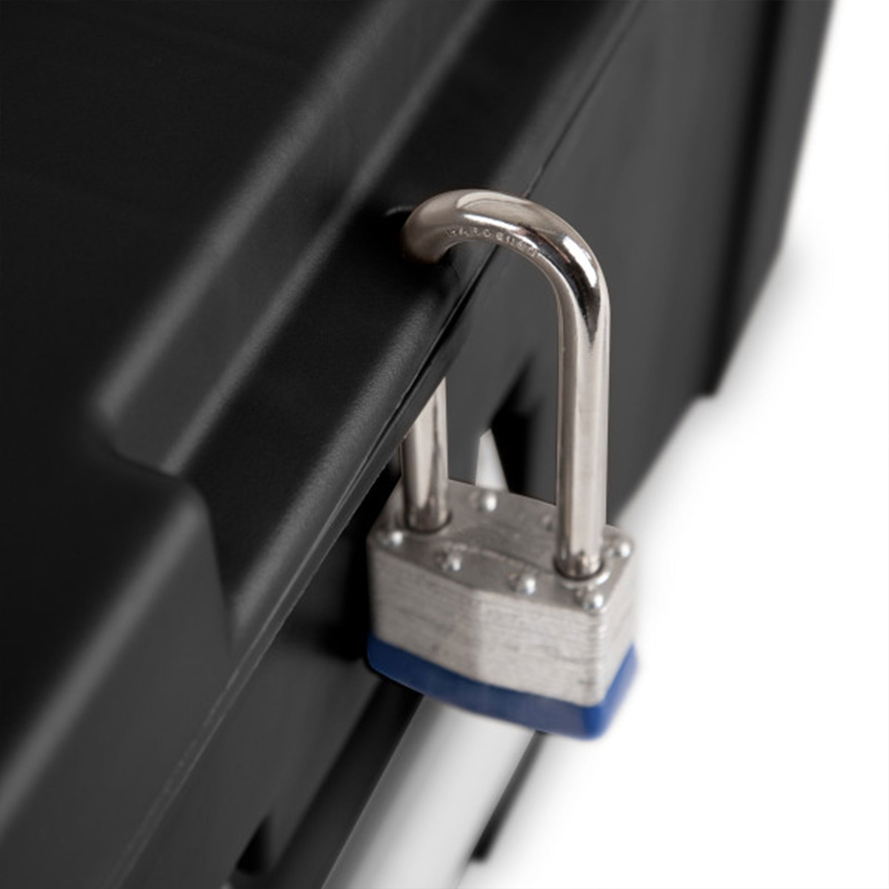 - Accepts standard-size padlock (not included) for added security and metal hinges and latches for added durability