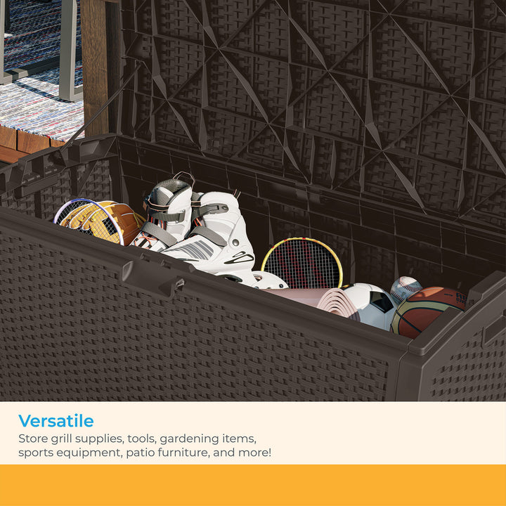 - 99-gallon capacity outdoor storage box designed to store a wide variety of items
