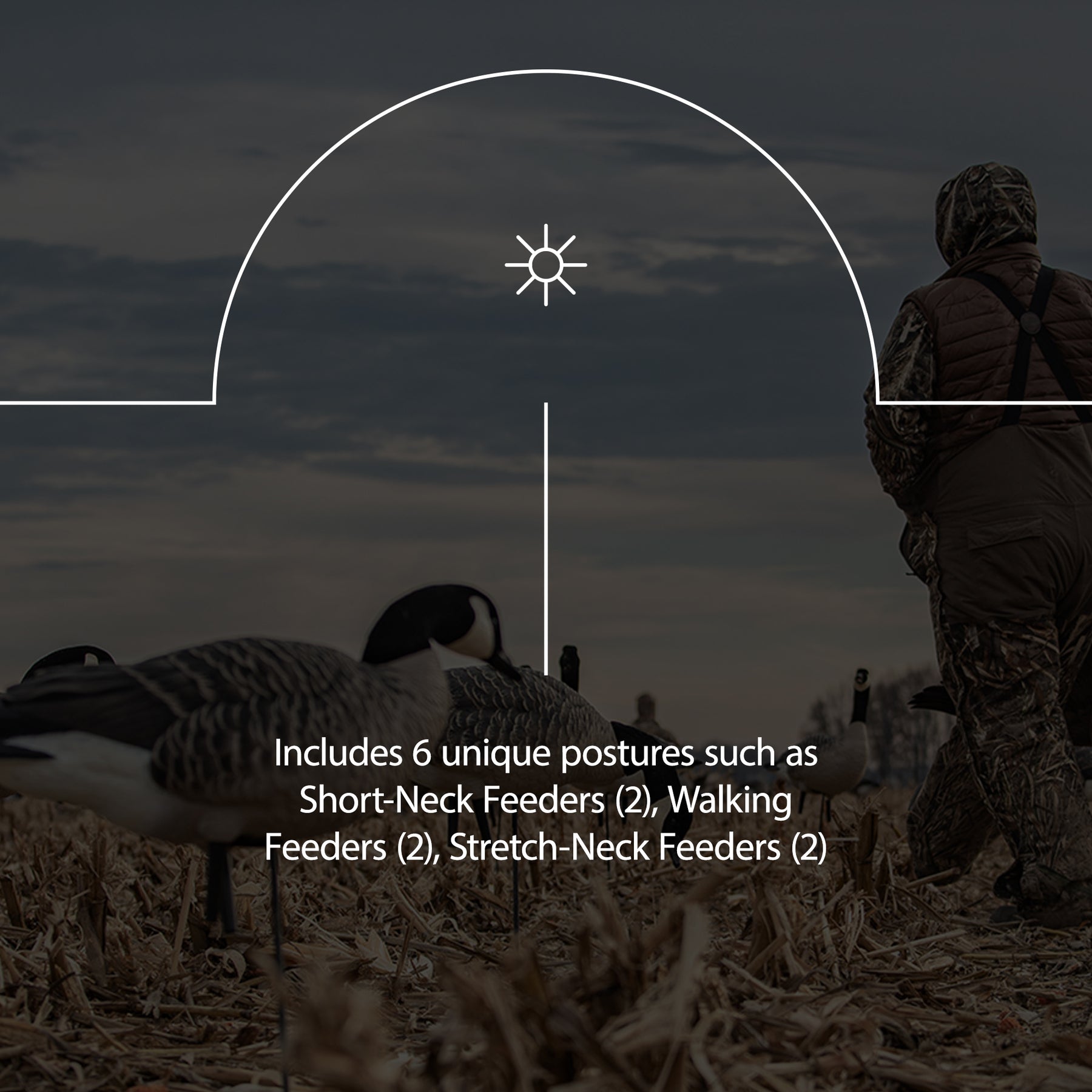 The Feeder Pack comes with 6 decoys in a variety of postures, including Short-Neck Feeders (2), Walking Feeders (2), and Stretch-Neck Feeders (2). Each posture is carefully crafted to replicate the natural movements and behavior of Canada geese, enhancing the realism of your decoy spread.