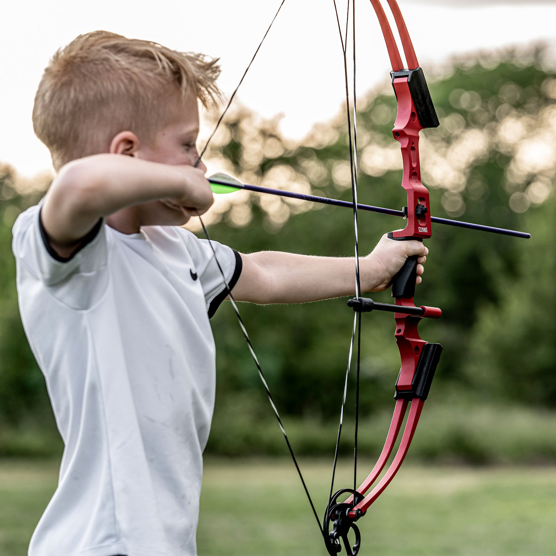 - Youth archery bow and arrow set designed for right-handed users; Bow features an adjustable draw length range of 14-25 inches and an adjustable draw weight of 6 to 12 pounds