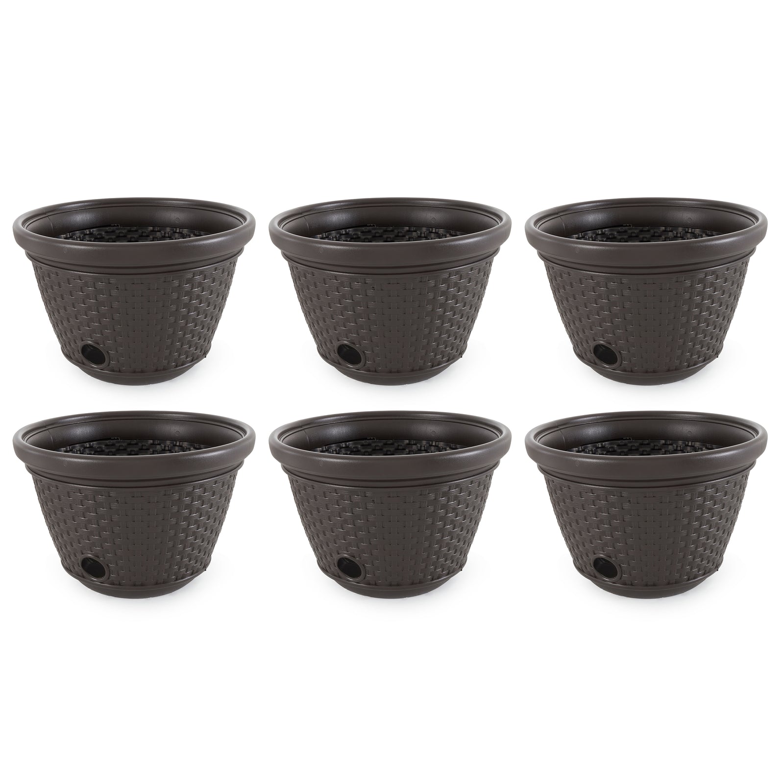 If you're tired of seeing a messy garden hose, then reel it in. Organizing your hose doesn't have to be a task. Keep your hose out of sight, but not out of mind with this 6 pack of attractive wicker pots. The Suncast Resin Hose Pot keeps up to 100-feet of 0.625-inch standard vinyl hose out of sight and conceals standard vinyl hoses. The drain holes in base to release trapped water to protect your hose. The heavy-duty resin construction is easy to maintain, while the lightweight construction makes this pot easy to move around. The classic wicker design is versatile and fits with most decors. This simple and convenient design makes storing your hose easy. This hose pot is designed with a convenient circular opening for hose connection to water supply.