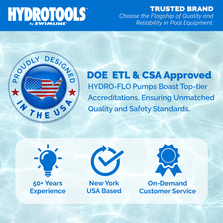Enjoy crystal-clear water with the Swimline HydroTools Hydro-Flo 1.5 HP Motor Pump for Above Ground Swimming Pools. It delivers powerful flow, adapts to various setups, guarantees quality, and follows all the necessary regulations to make it your go-to solution for achieving great water performance.