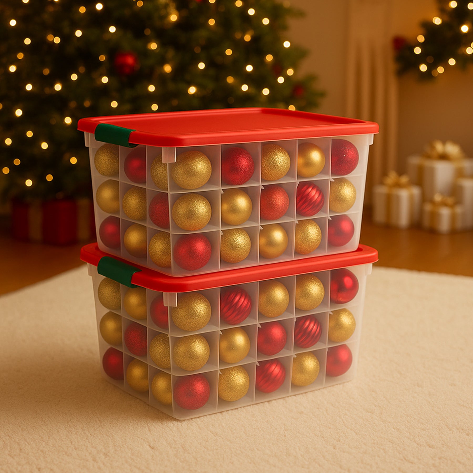 Made from durable see-through plastic that withstands ongoing use, this holiday storage container has removable dividers that provide space for ornaments and latching handles for comfortable transport and stacking. Most importantly, you don't have to worry about losing items since the lid features sturdy ergonomic latches locking the cover tightly and securely.