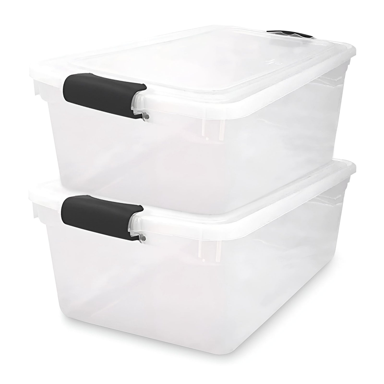 - Contain your chaos with this set of (2) 64 QT clear storage totes ideal for clothing, office supplies, personal items, and more