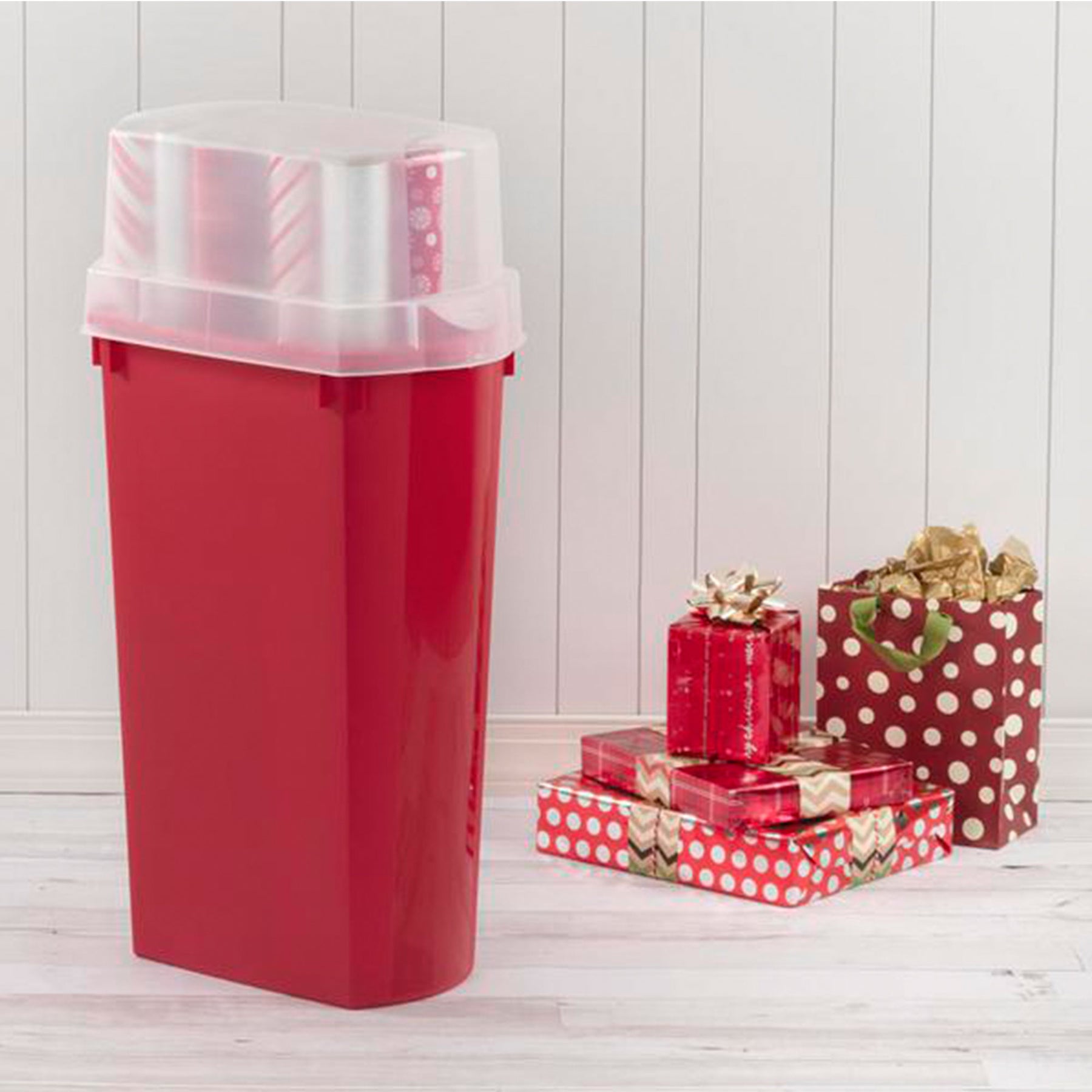 Standing vertically, these storage boxes save you space and can each keep 25 of your 30-inch long wrapping paper rolls intact and neatly stored during and after the holidays. They feature a snap-on lid with a lift-top to keep your gift paper safe and secure. The bases and lids are see-through for quick and easy viewing and they boast a festive, rocket red color to add a little pizzazz to your storage room. For added versatility, these storage containers may also be used for many other purposes including recycling, pet kibble, or clothes.
