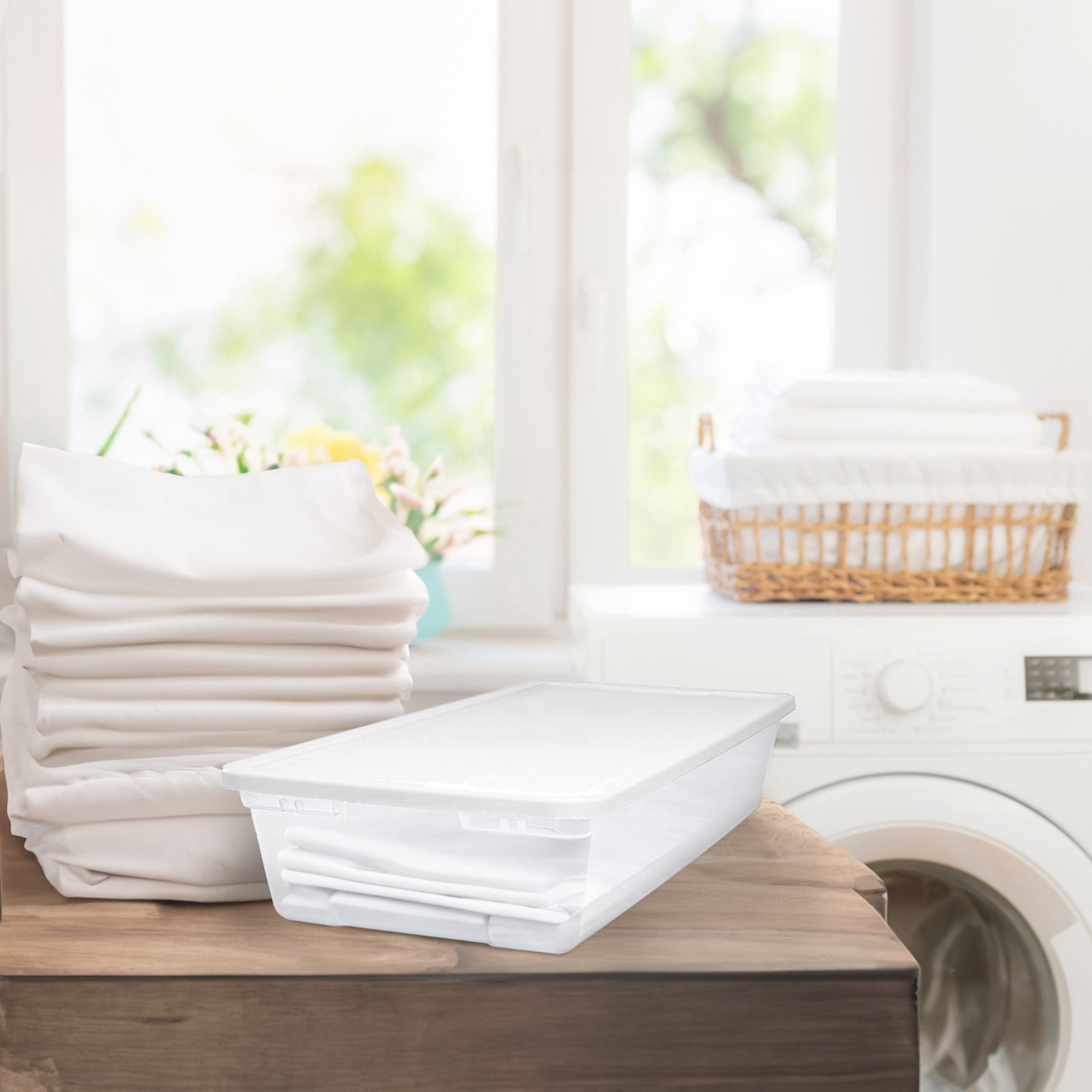 Profoundly indented lids and a modular design enable secure stacking, optimizing vertical storage capacity in your kitchen, bathroom, and closet. Bins fit snugly when stored away, promoting efficient organization. Ideal for bathroom, kitchen, garage, dorm, and off-season storage, these storage containers are designed for extended and enduring utility. Each bin is constructed of robust, high-strength plastic with dimensions of 15.5 inches long, 34.38 inches wide, and 6 inches tall. With the 6-inch height, the clear organizer box is great for under-bed storage, too!